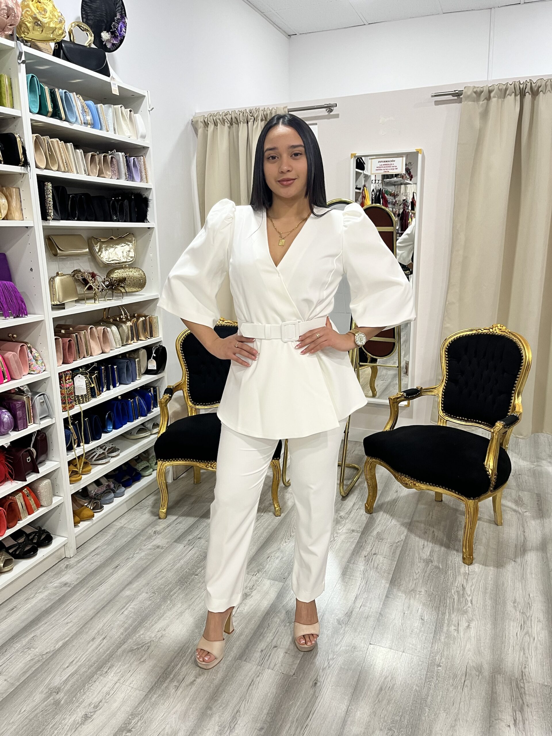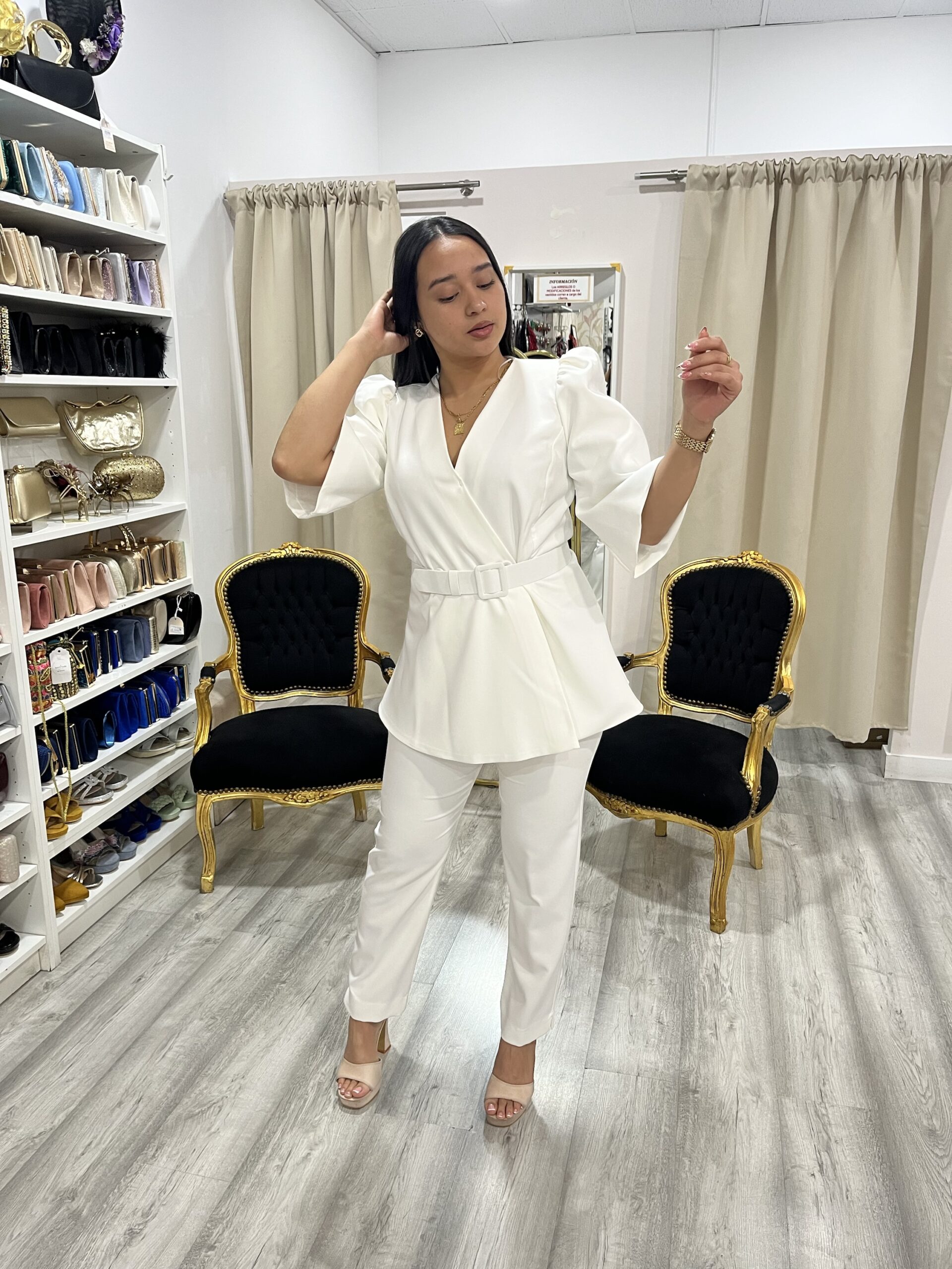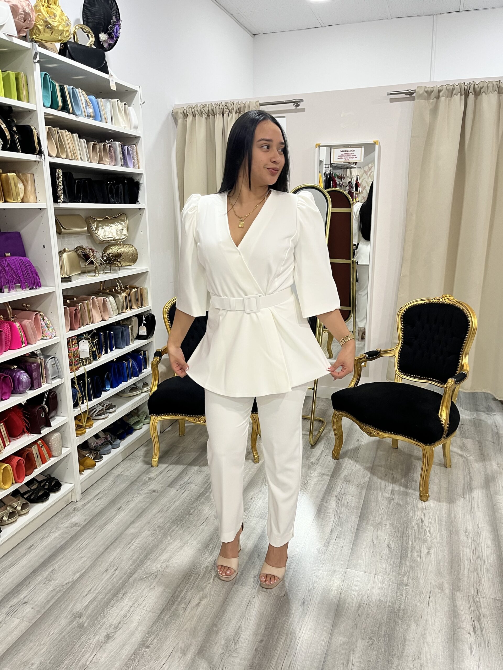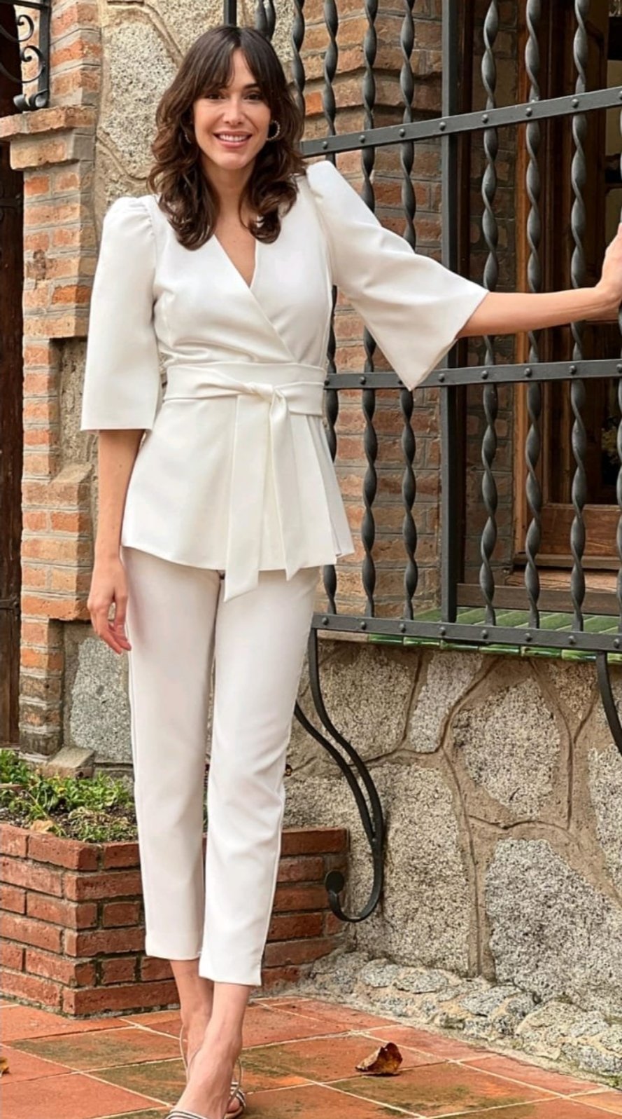 Conjunto elegante para ti que eres una novia moderna y contemporánea un conjunto de dos piezas en tono marfil. La chaqueta cruzada con escote en V, mangas acampanadas y cinturón a juego realza la silueta con un estilo femenino y sofisticado. El pantalón recto de corte tobillero aporta comodidad y equilibrio, convirtiéndolo en una opción ideal para eventos especiales, celebraciones civiles o looks formales con un toque moderno.