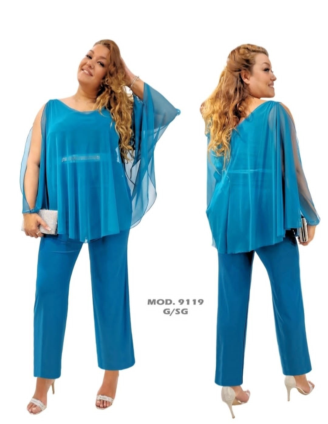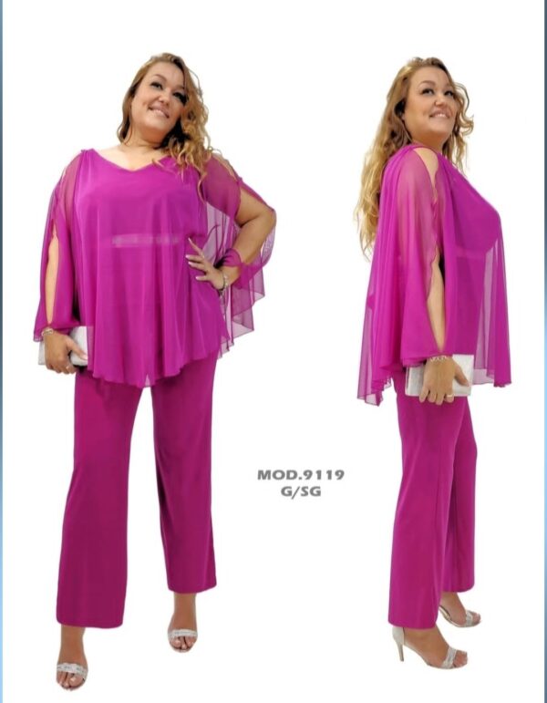 Mono con Blusa en forma de capa, escote V y detalle plateado en los hombros. – Pantalon palazzo liso y elastico.