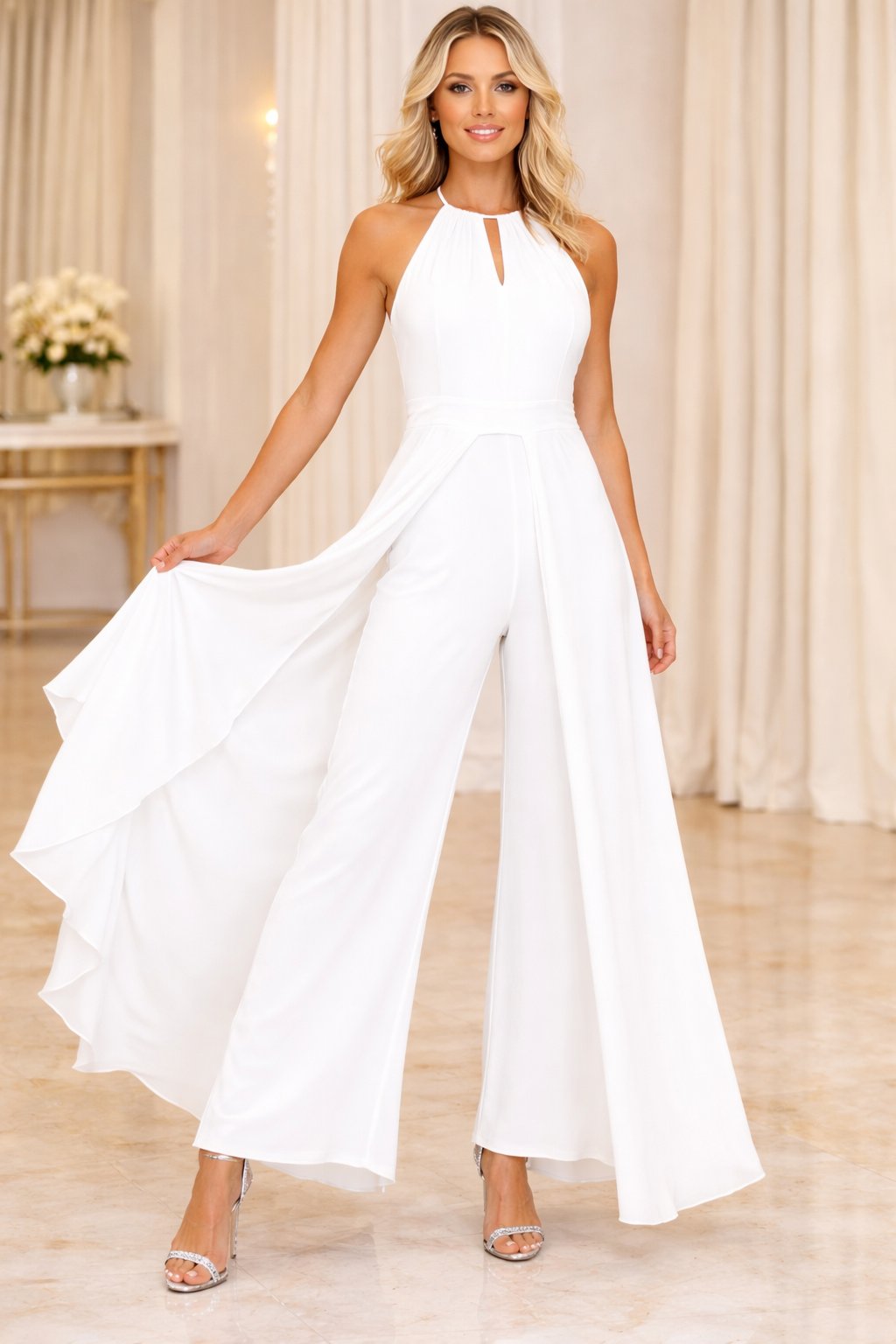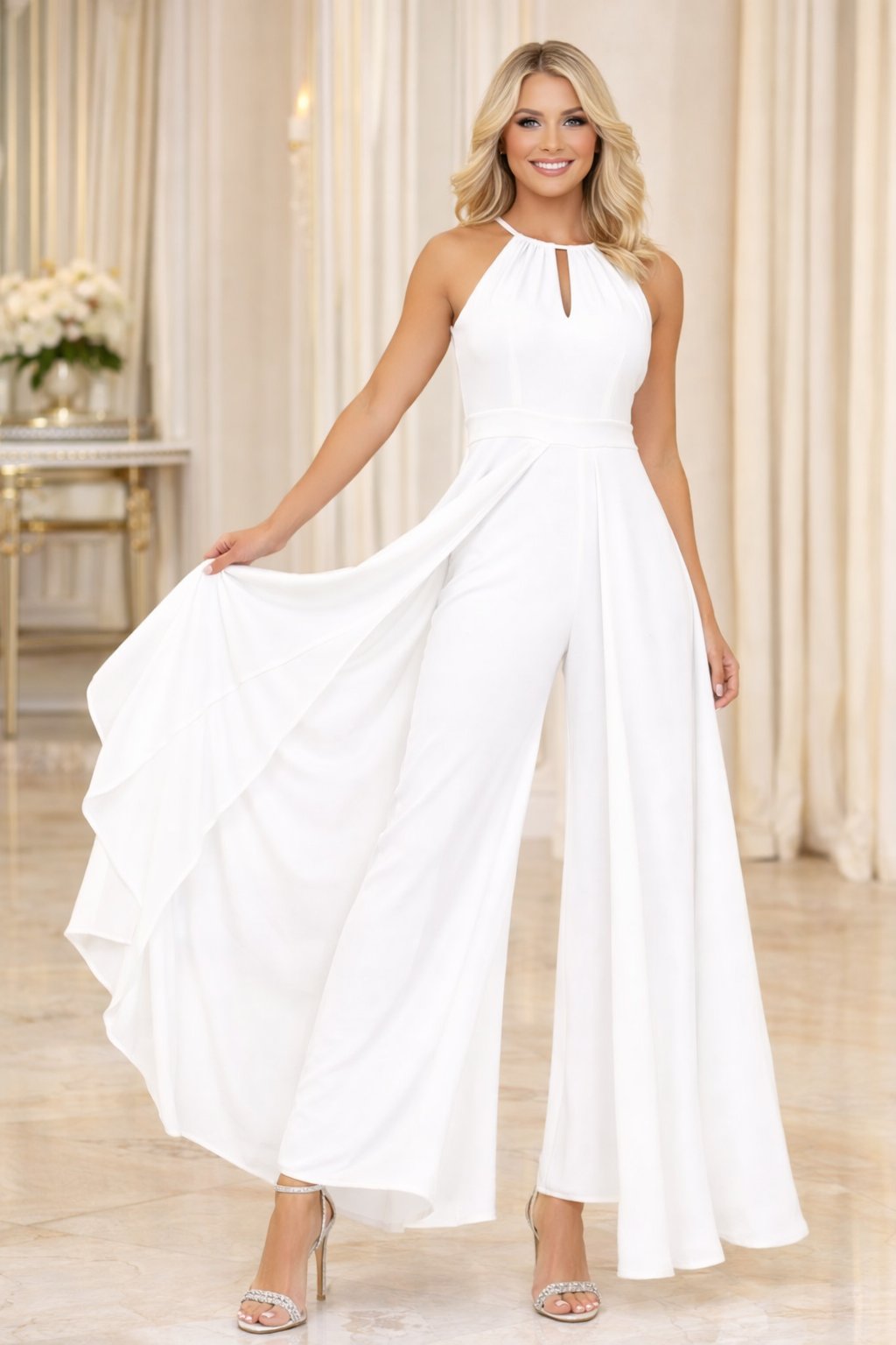 Dile adiós al vestido tradicional. Este jumpsuit con capa integrada es la tendencia más fuerte de la temporada. La caída del tejido crea un movimiento increíble al caminar, dándote esa entrada triunfal que te mereces.