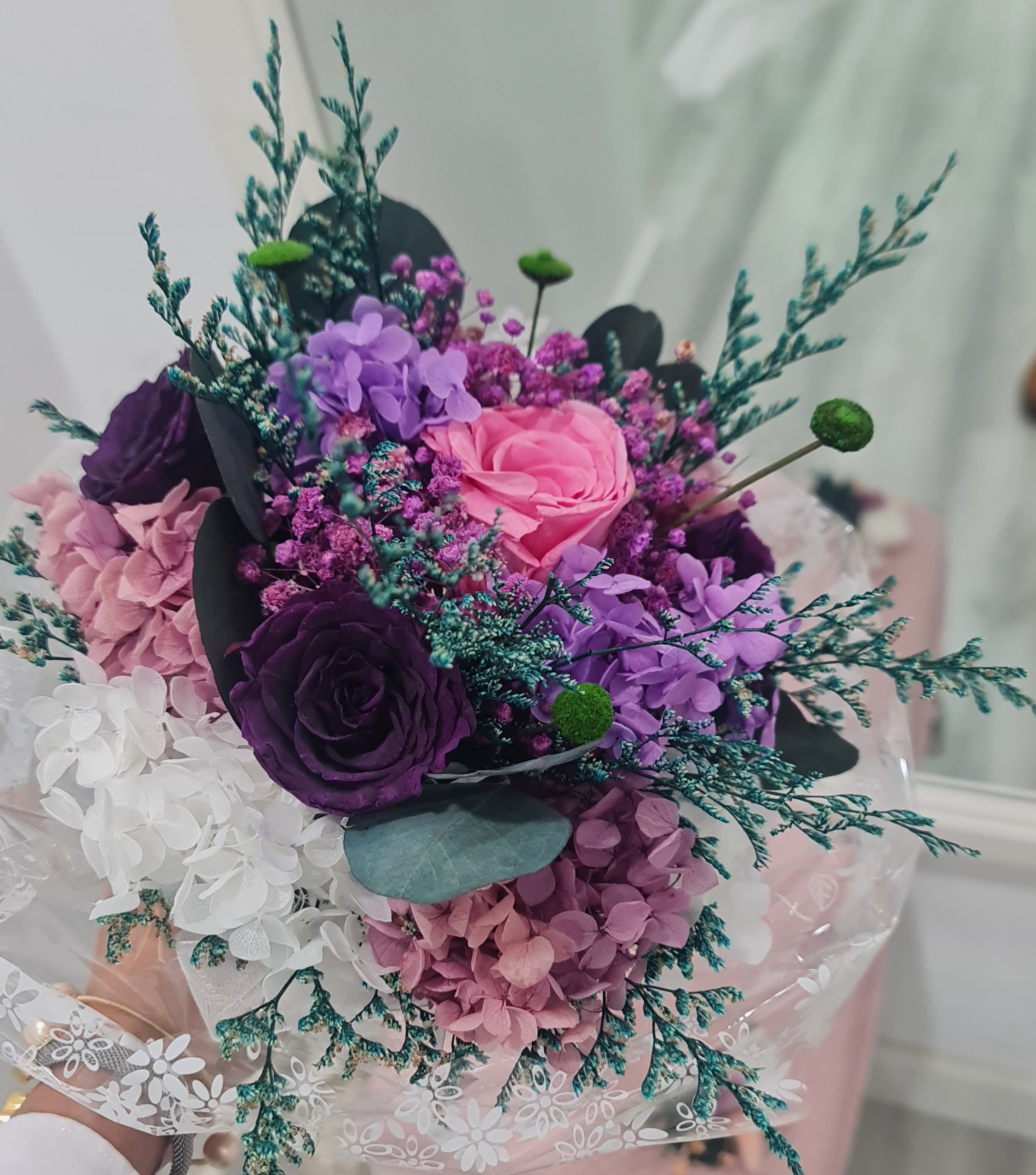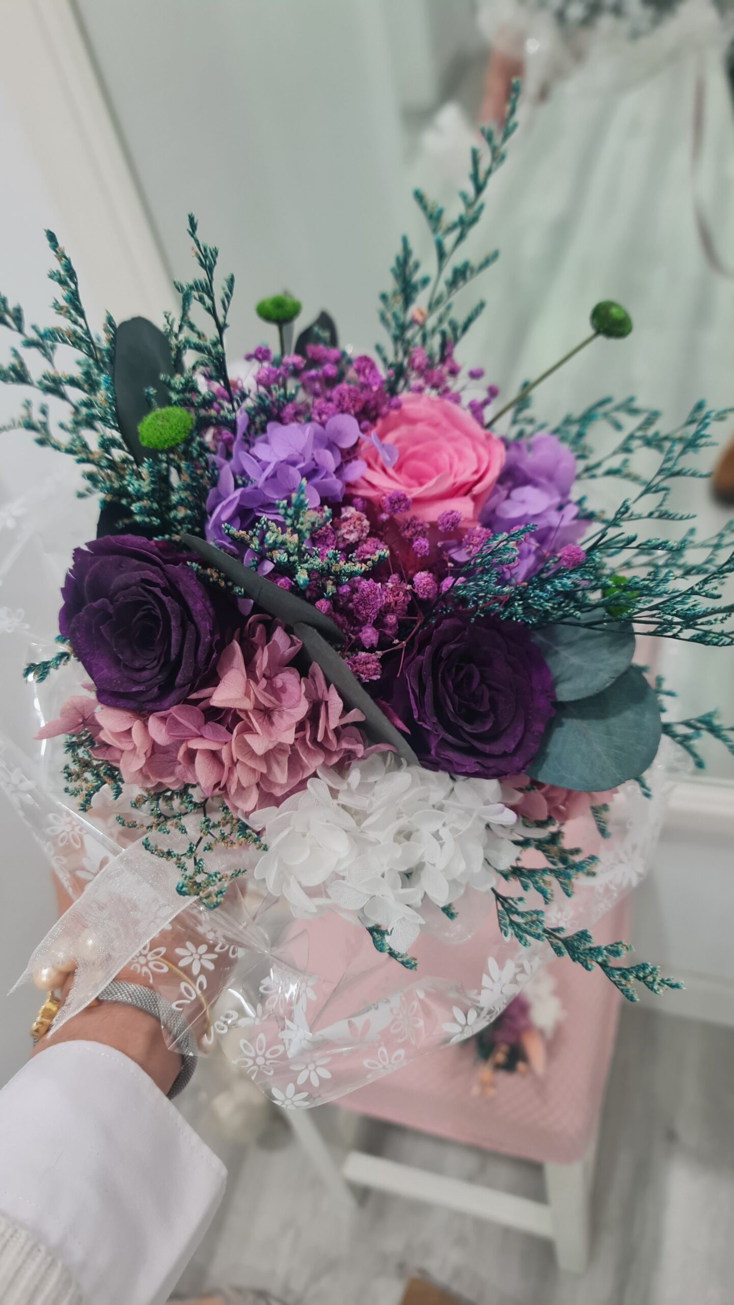Un ramo de novia preservado romántico y silvestre que enamora con cada textura. Rosas, hortensias y eucaliptus brillando en todas sus esplendor.