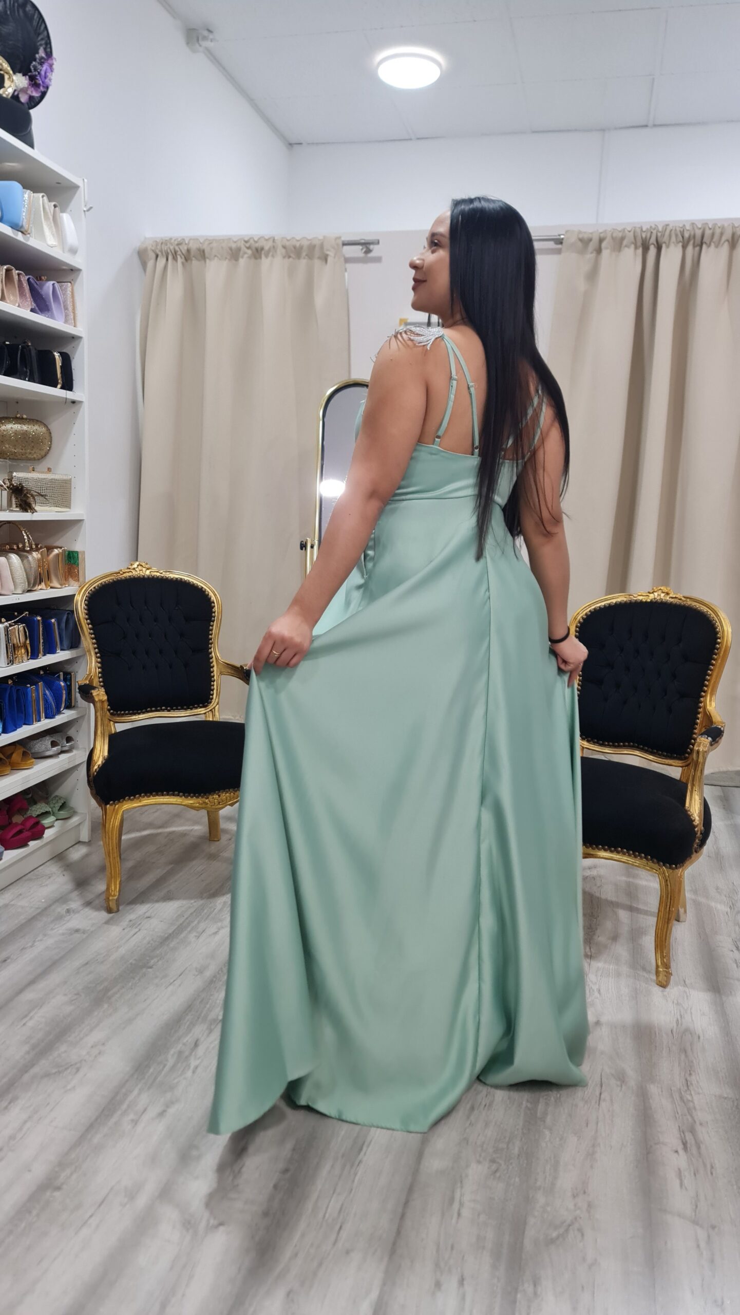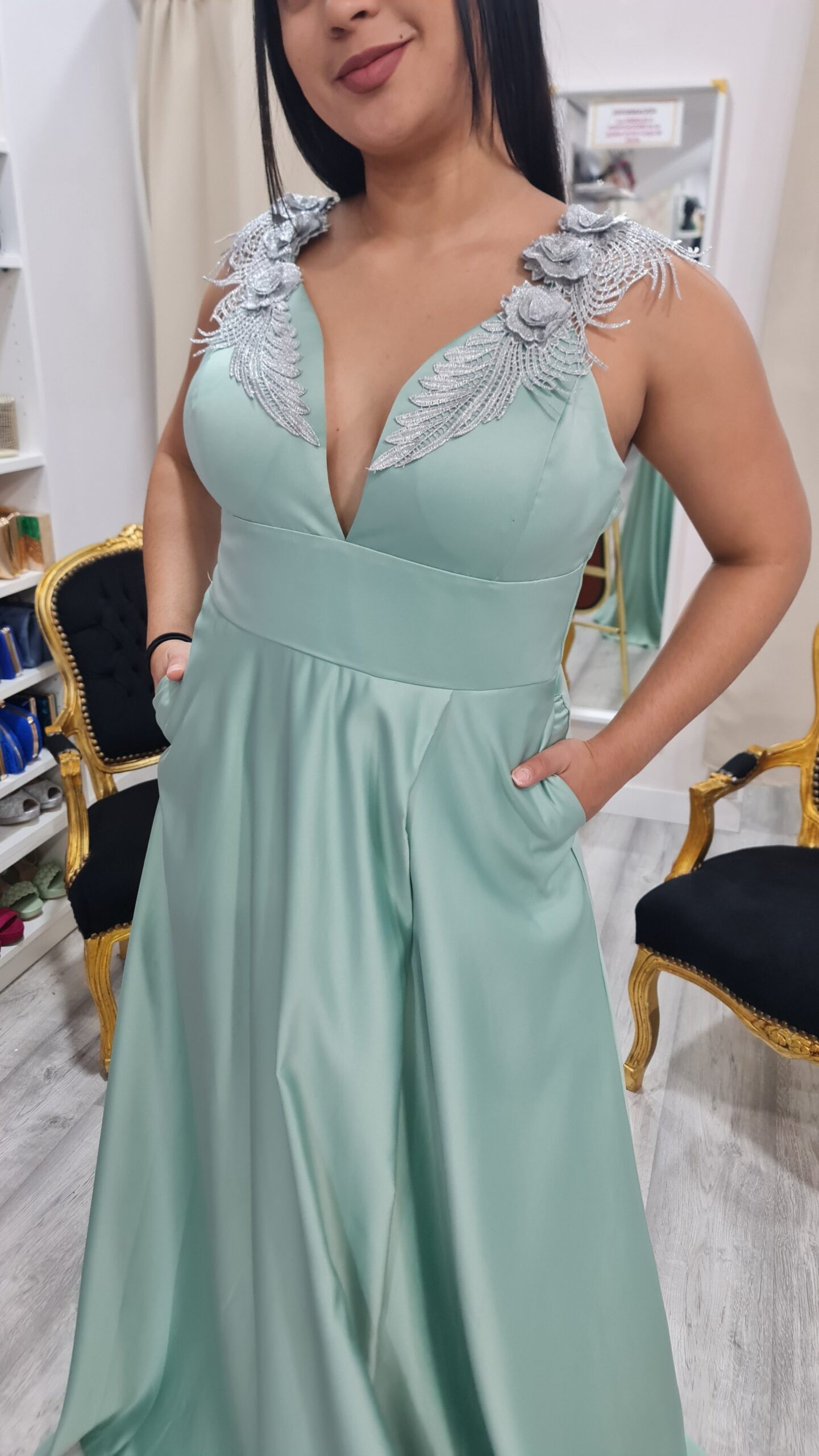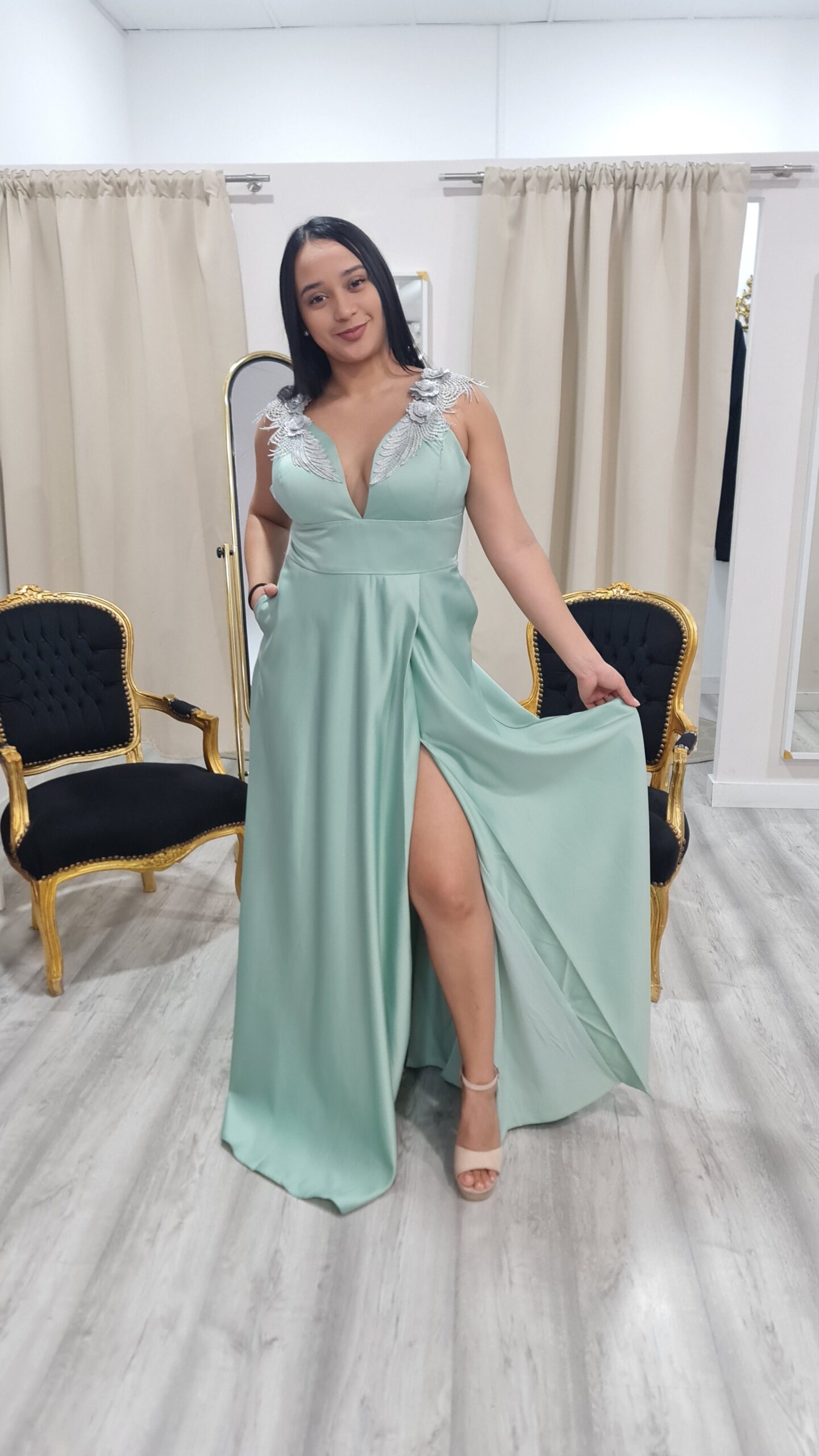Vestido largo elegante y sofisticado, ideal para invitada o graduación. Presenta un favorecedor escote en V adornado con delicadas aplicaciones bordadas que aportan brillo y distinción. Su falda fluida con abertura lateral añade movimiento y un toque sensual, mientras el suave tono verde agua transmite frescura y elegancia, creando un look femenino y memorable para ocasiones especiales.