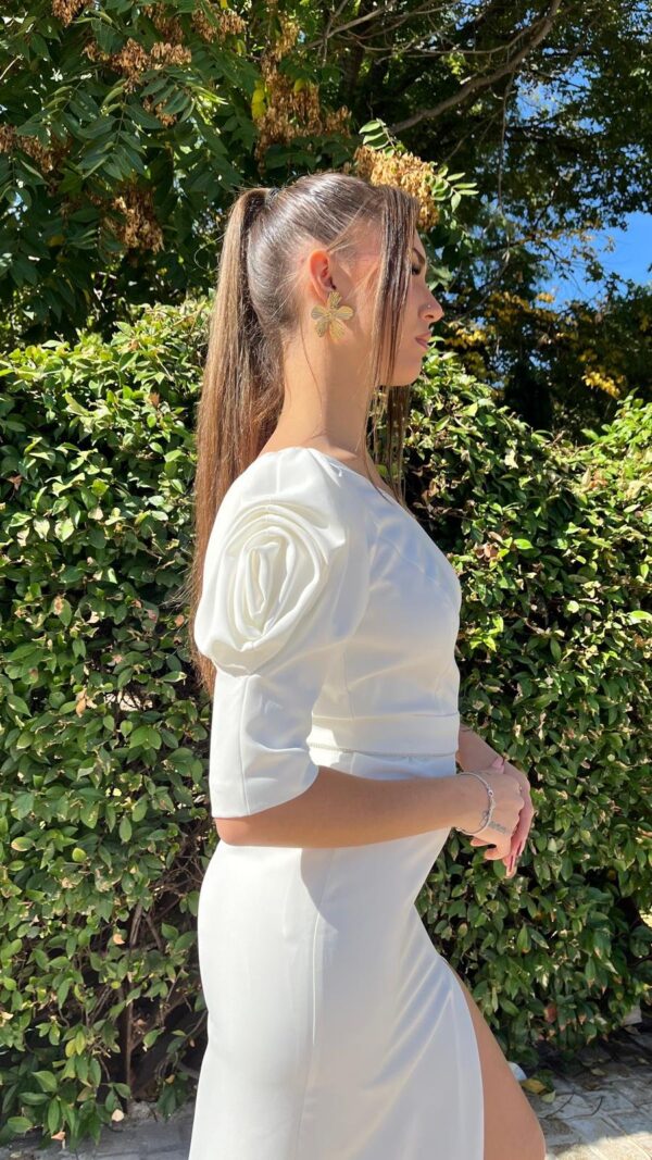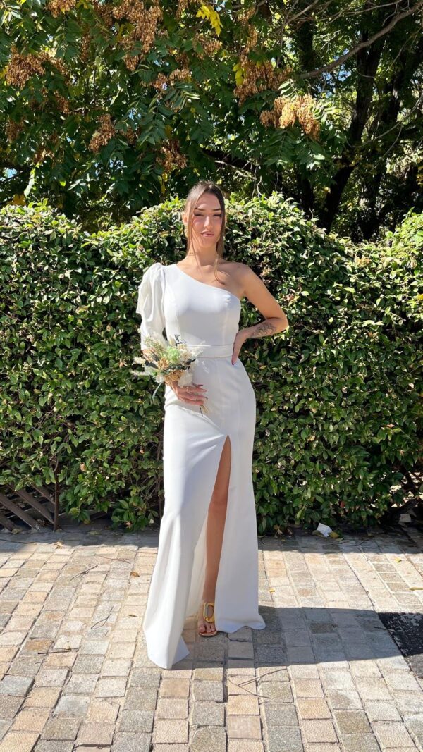 Este vestido blanco de un solo hombro es la combinación perfecta entre elegancia y modernidad. Su diseño asimétrico con manga abullonada aporta un toque sofisticado, mientras que la abertura lateral añade un aire de frescura y sensualidad. El corte entallado realza la silueta de manera natural, ideal para una novia civil o una ocasión especial con estilo minimalista y refinado. 🤍