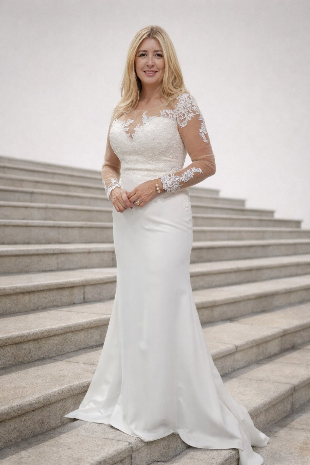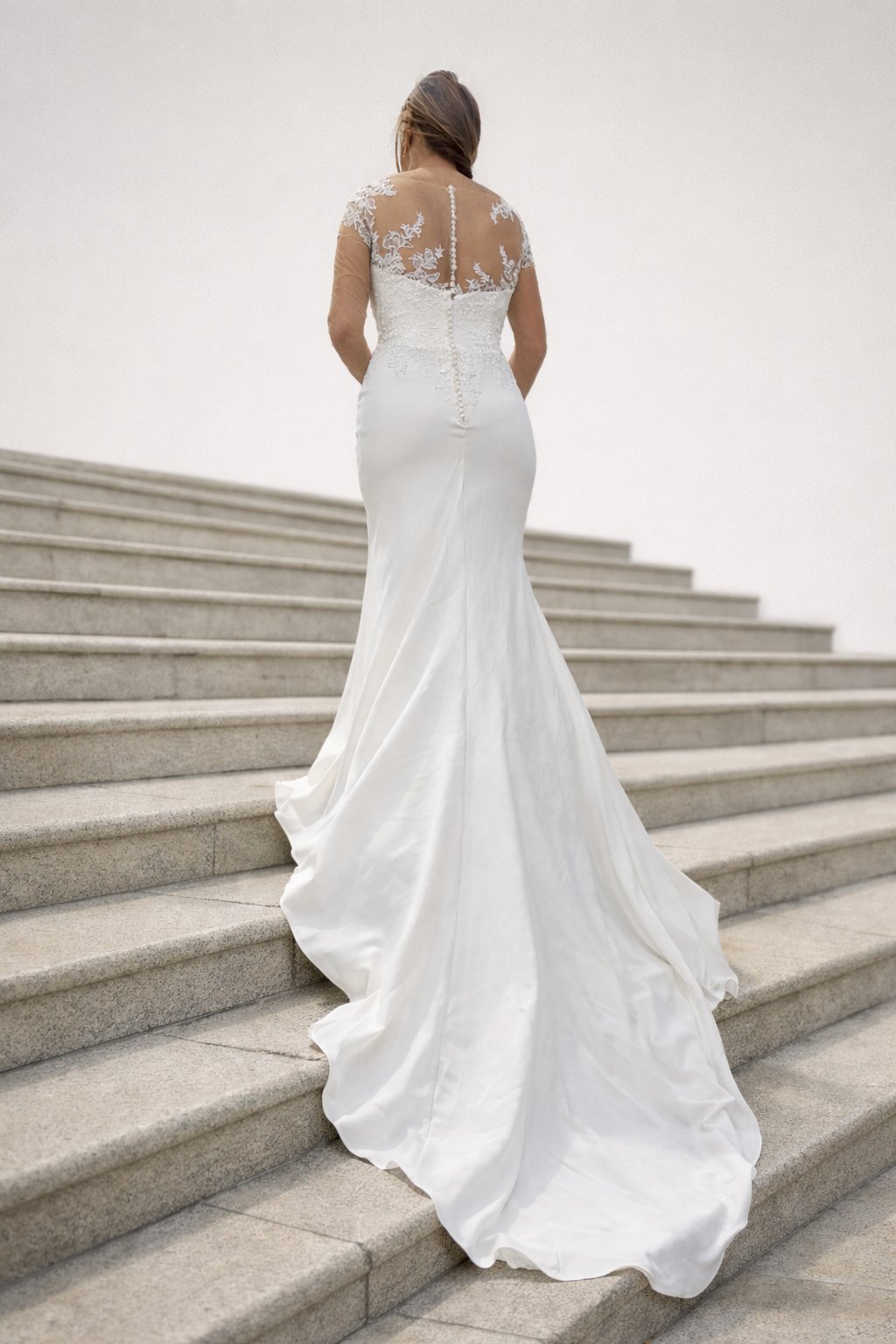 Este vestido es pura magia y romanticismo. 🤍 Su diseño combina la delicadeza del encaje con la elegancia de una caída fluida que acaricia el suelo. La espalda ilusión, adornada con detalles bordados y una hilera de delicados botones, crea un efecto encantador y femenino. Las mangas de tul con encaje aportan un aire etéreo, mientras que la falda con suave cola añade movimiento y elegancia en cada paso.
