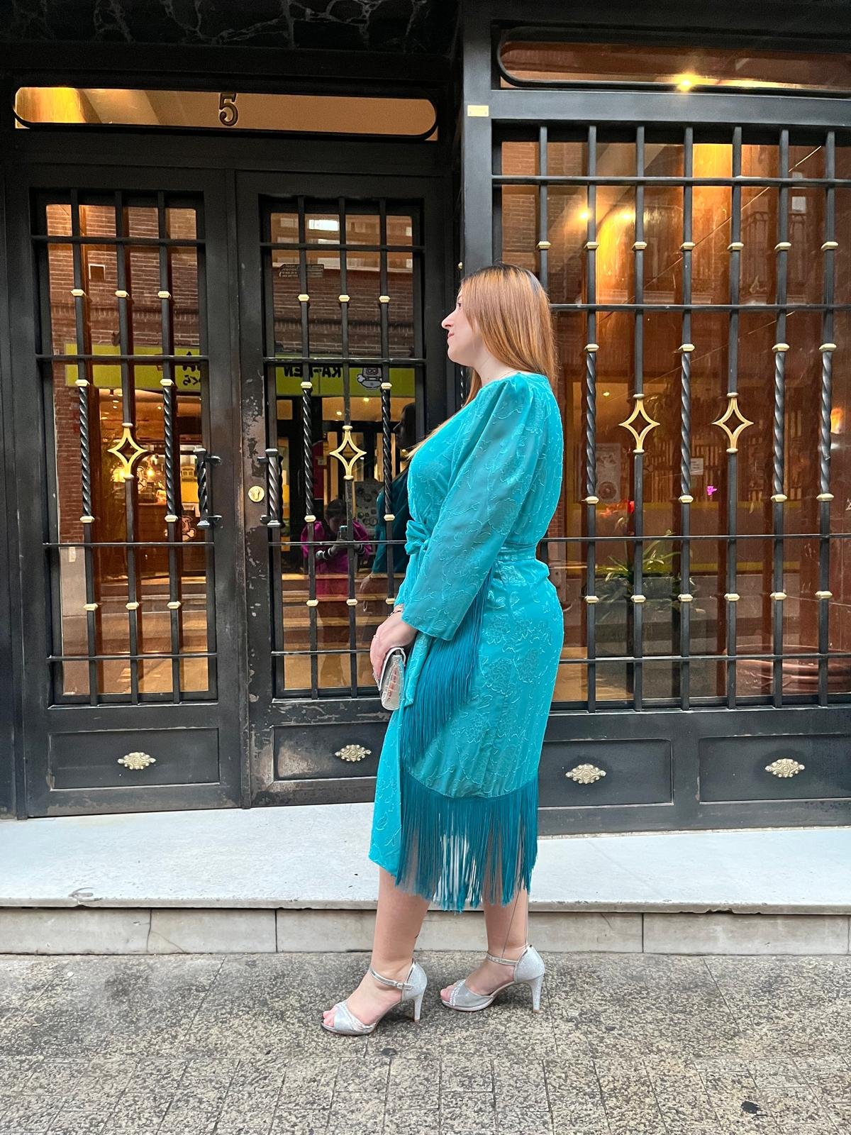 vestido con escote V, y una mini falda debajo de una falda grandiosa de seda.