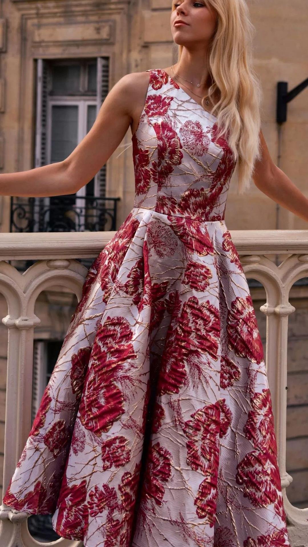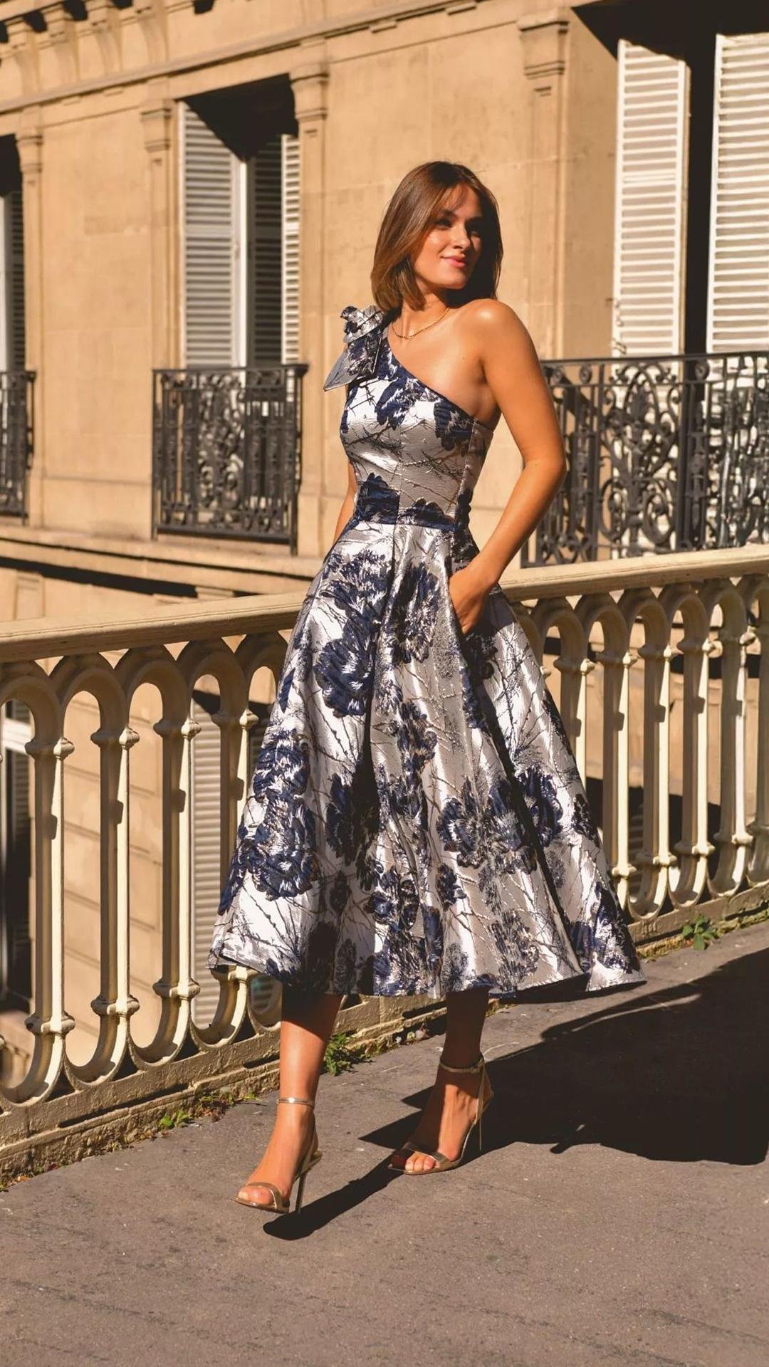 El cuerpo entallado define la cintura y da paso a una falda evasé con mucho vuelo, que se abre de manera armónica gracias a la rigidez del tejido, aportando movimiento y presencia al caminar. El escote asimétrico de un solo hombro, adornado con un detalle tipo lazo o flor estructurada, añade un toque original y contemporáneo al diseño.