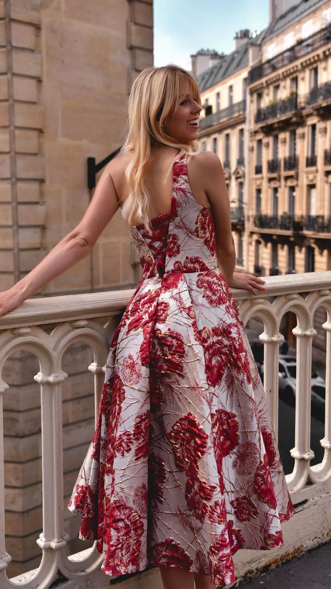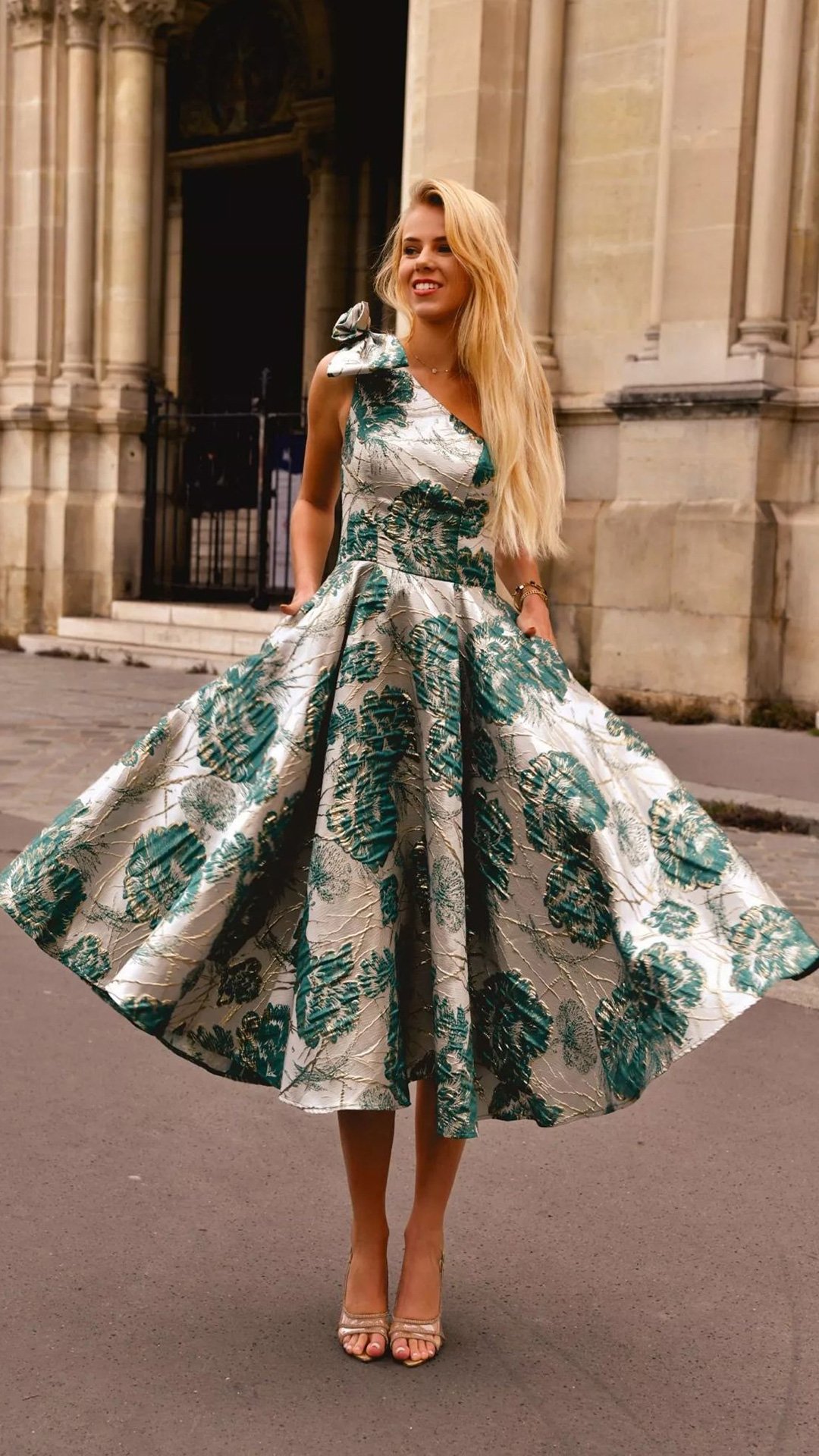 Este vestido presenta un estilo sofisticado y femenino, con una clara inspiración cocktail / midi de corte estructurado. Está confeccionado en un tejido brocado o jacquard, reconocible por su cuerpo firme y ligeramente satinado, que aporta volumen y mantiene la forma de la falda. El estampado floral en tonos verdes contrasta con el fondo claro, creando un efecto elegante y llamativo, ideal para eventos de día o celebraciones especiales.