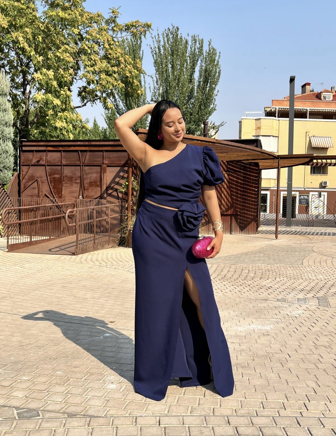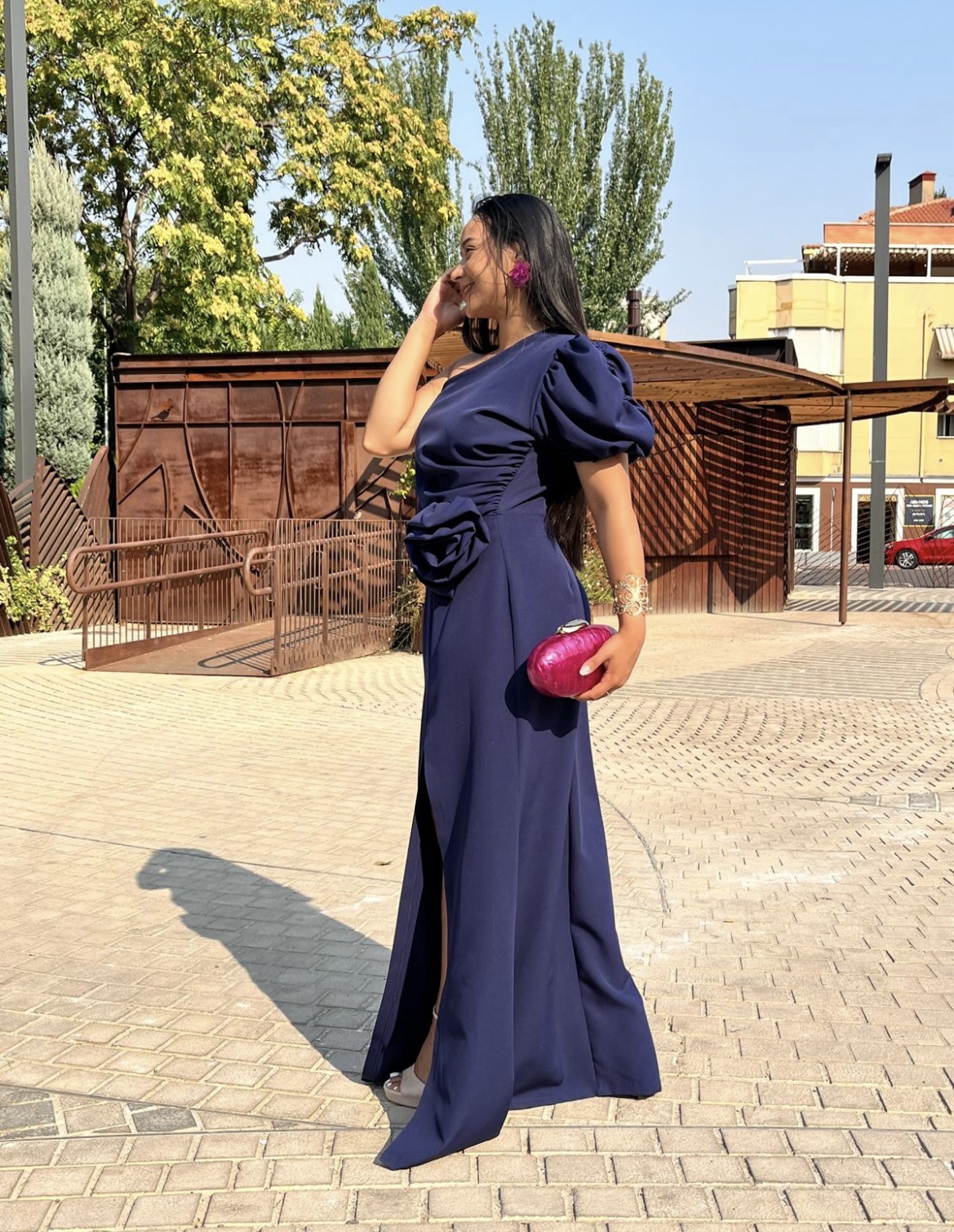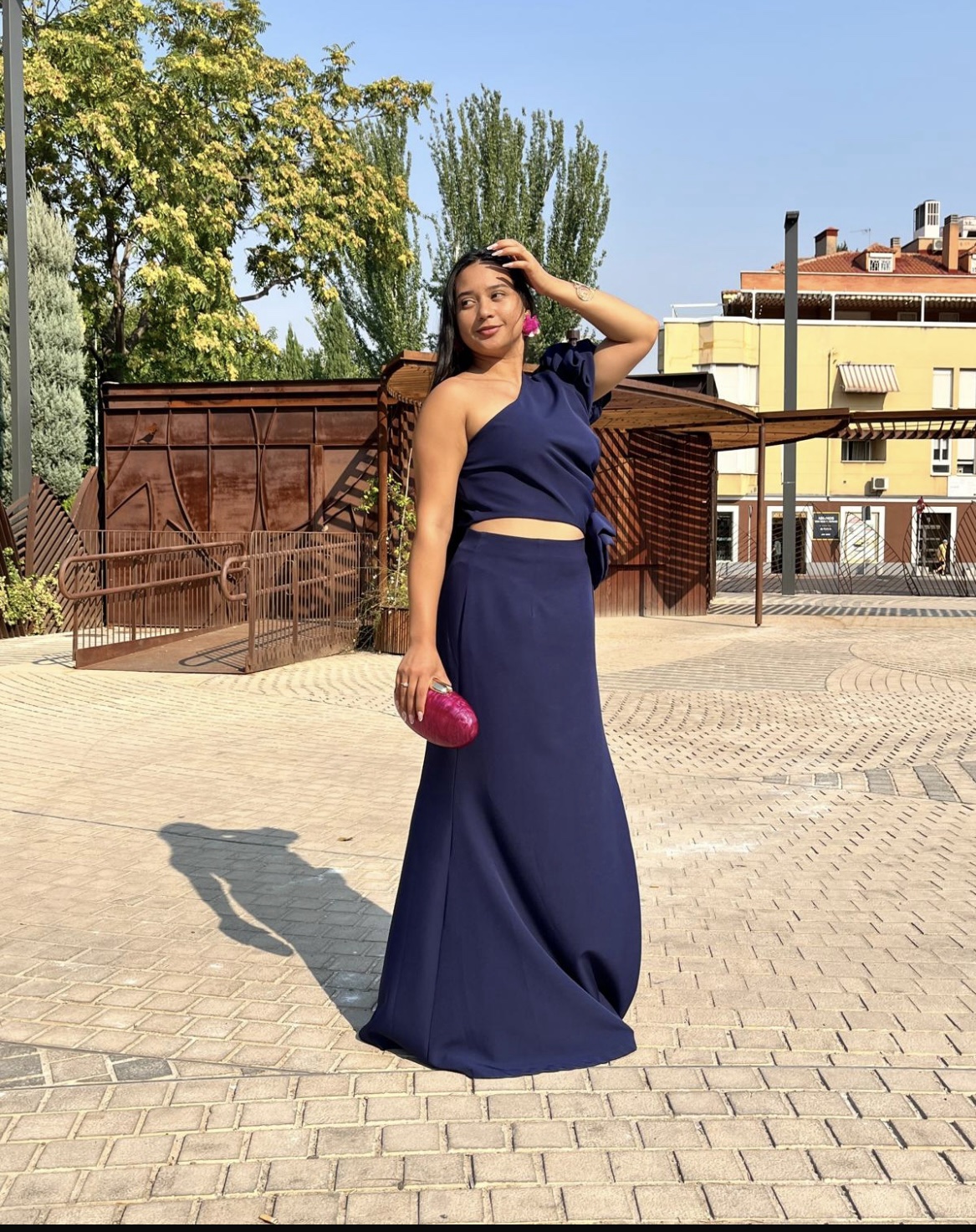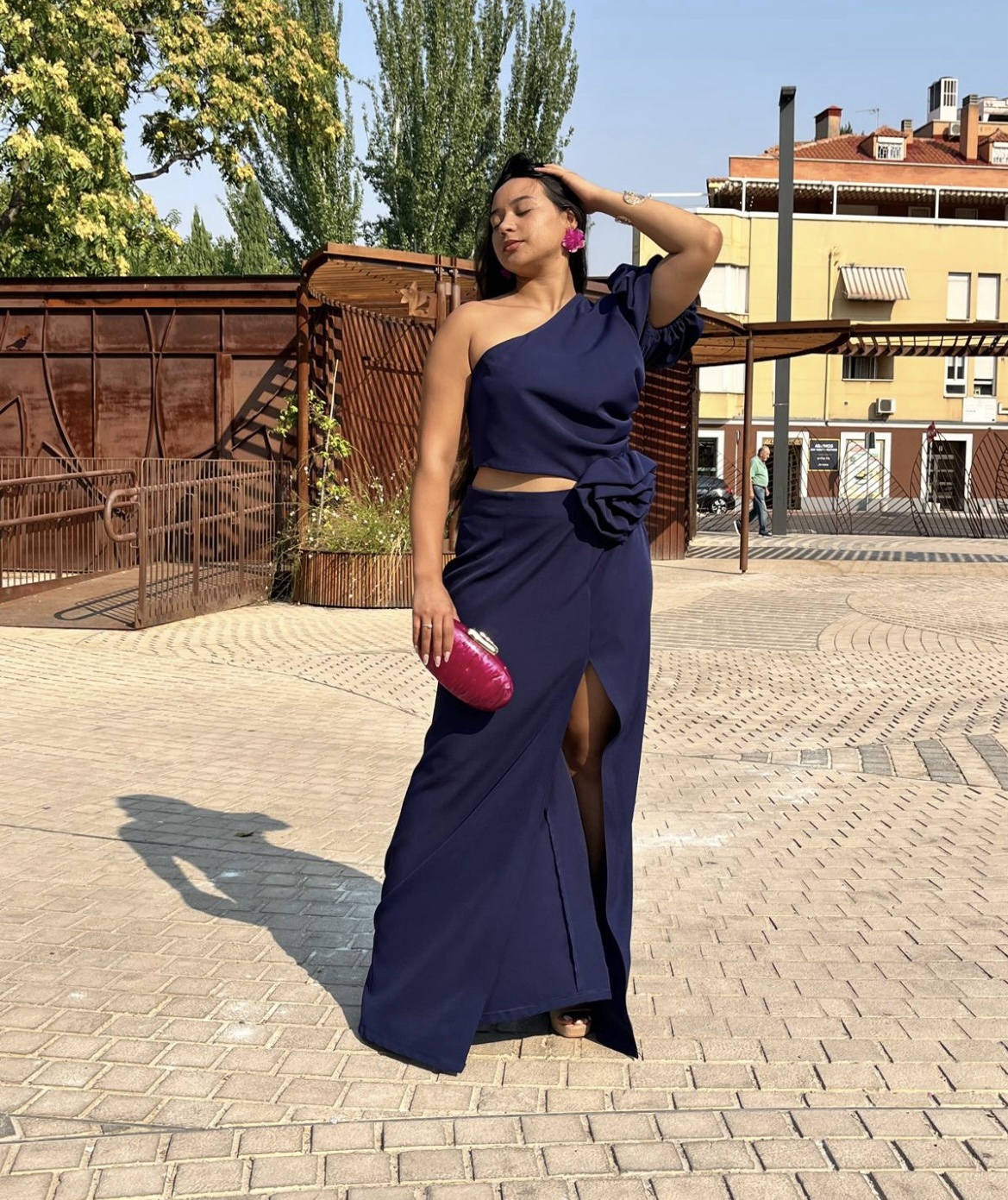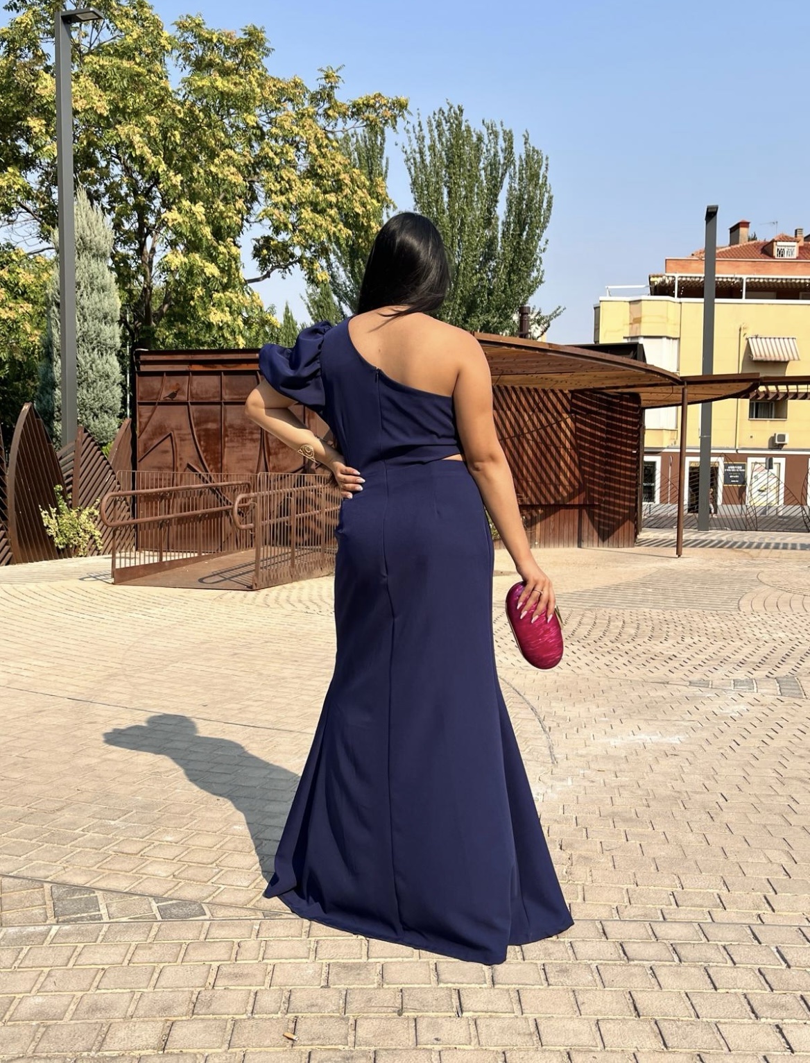 Un tono azul noche siempre es adecuado en todas las temporadas, el corte asimétrico estiliza la figura