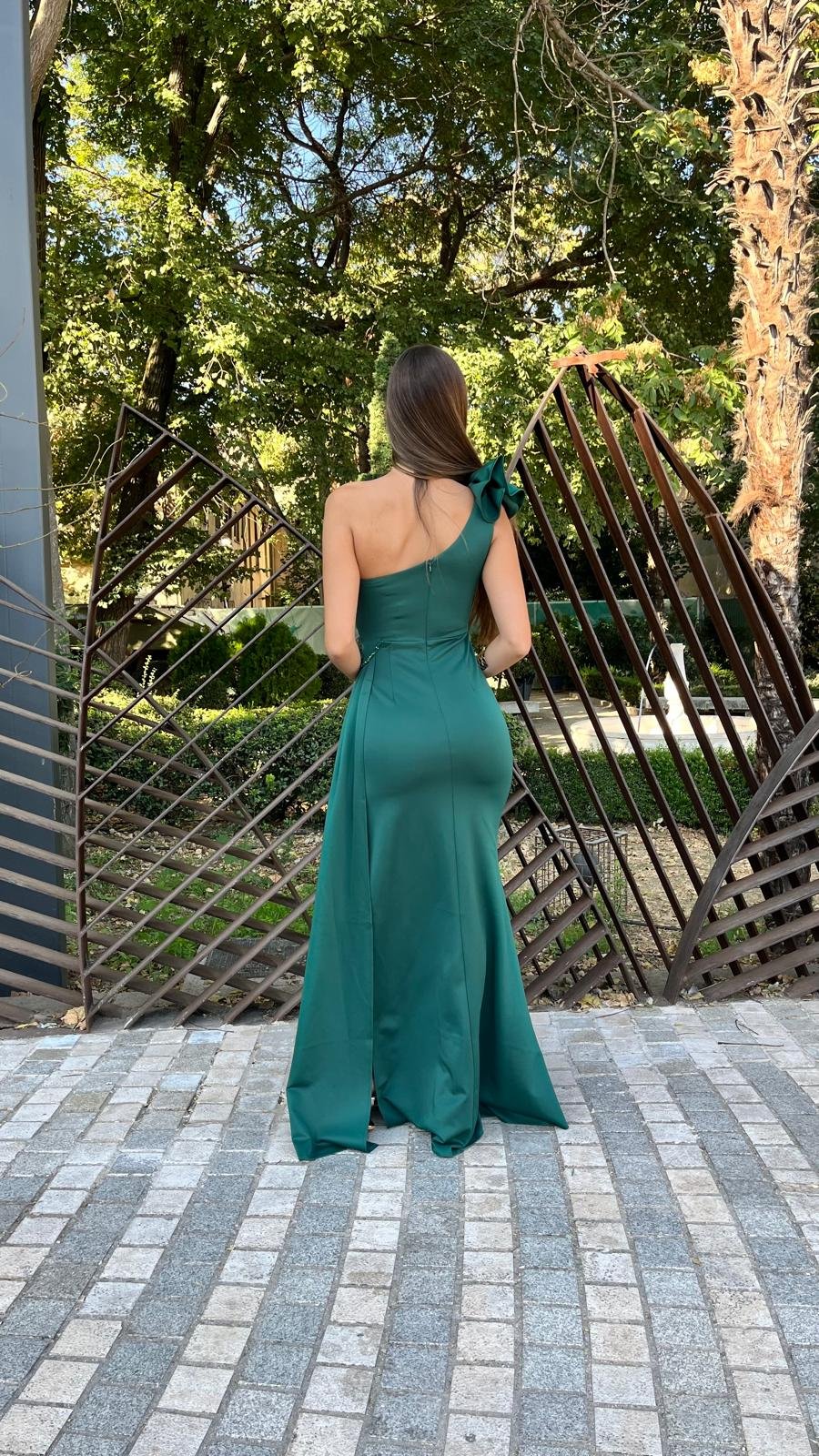 El vestido es de color burdeos, tiene un diseño de un solo hombro y una silueta ajustada. Presenta una abertura alta en uno de los lados y un gran detalle de flor rizada en el hombro. Es elegante y sofisticado, ideal para una ocasión especial.