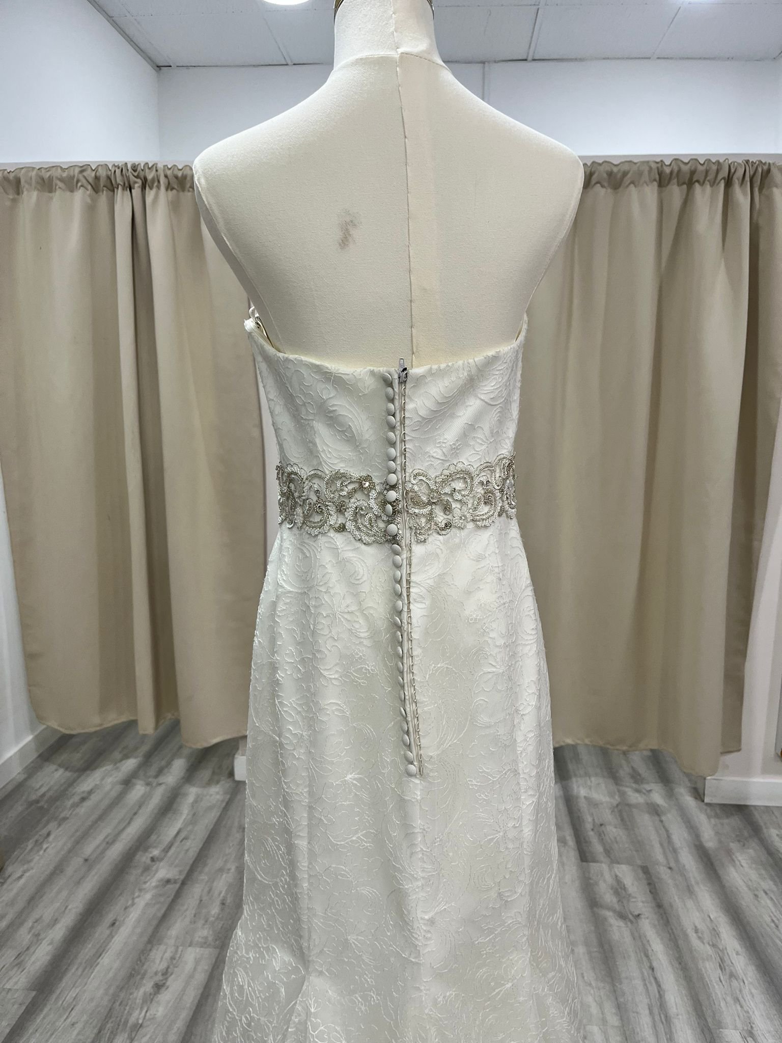 Este vestido, visto desde la espalda, revela toda su magia y sofisticación. La parte trasera mantiene una línea limpia y refinada que deja respirar al diseño, permitiendo que el encaje sea el verdadero protagonista. El escote recto en la espalda, sutil y elegante, aporta equilibrio y serenidad, mientras que el cierre central estiliza la silueta y refuerza la sensación de estructura y armonía.