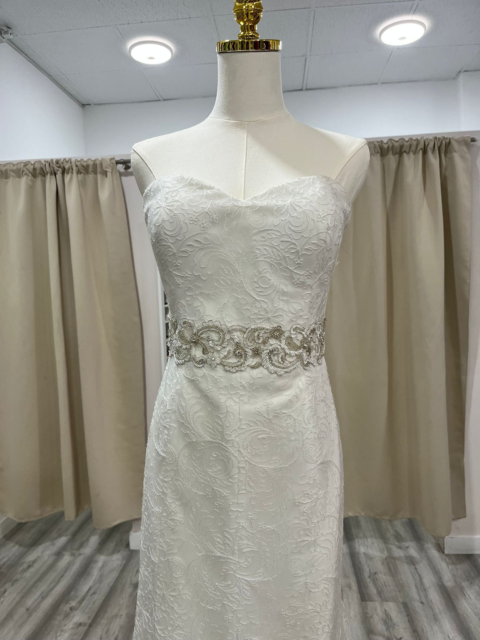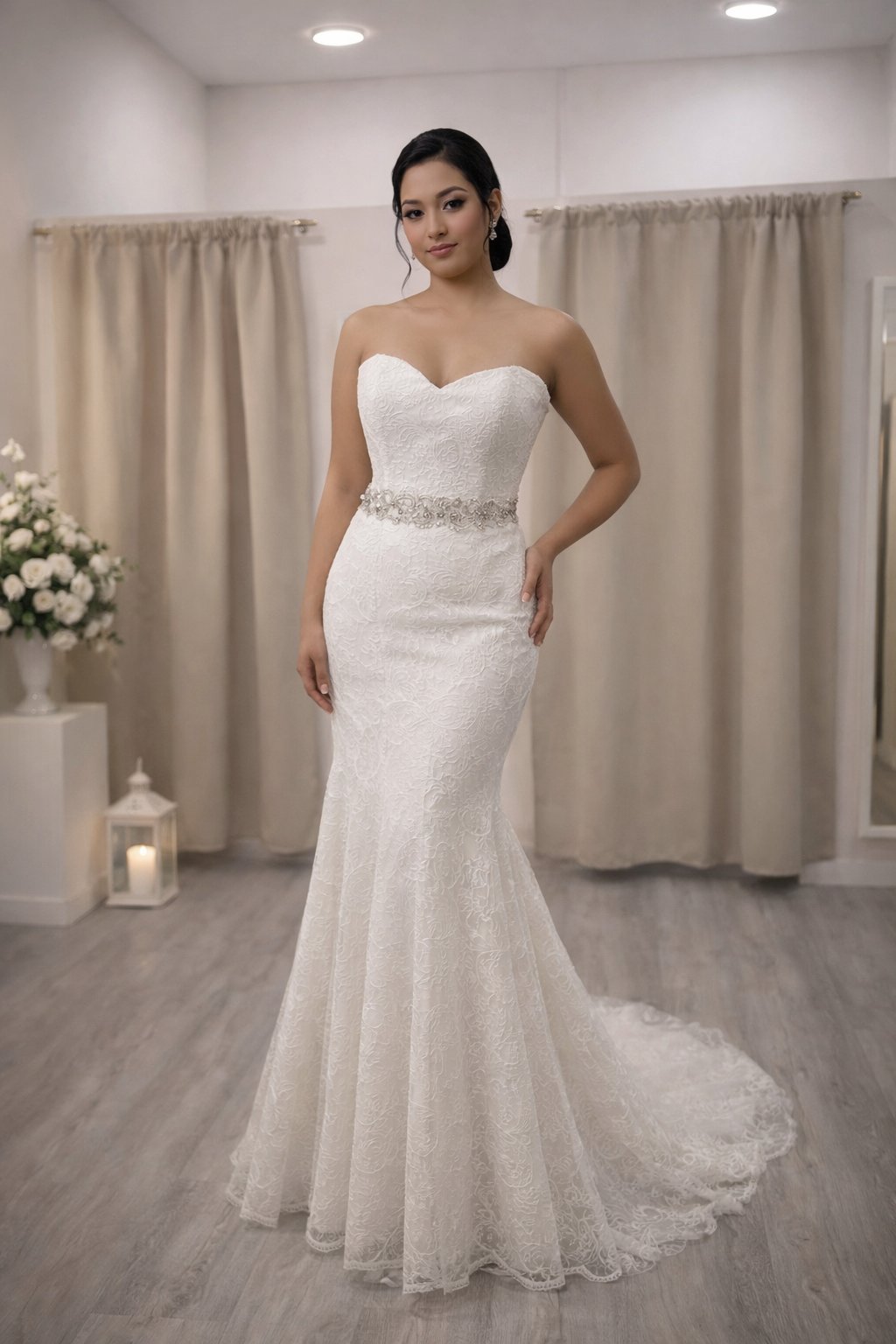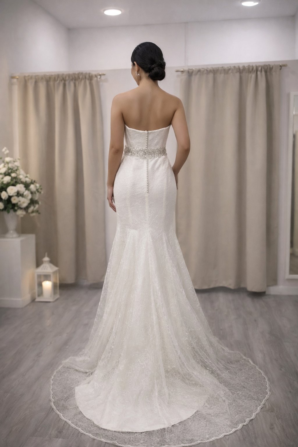 La cintura, delicadamente marcada por un cinturón joya, actúa como punto de unión entre el cuerpo y la falda, realzando la figura con discreción y aportando un toque de brillo muy fino, sin restar protagonismo al encaje. A partir de ahí, el vestido se transforma en pura poesía: la cola amplia y envolvente, confeccionada en un encaje exquisito, se despliega con una caída fluida y majestuosa que acaricia el suelo con elegancia.