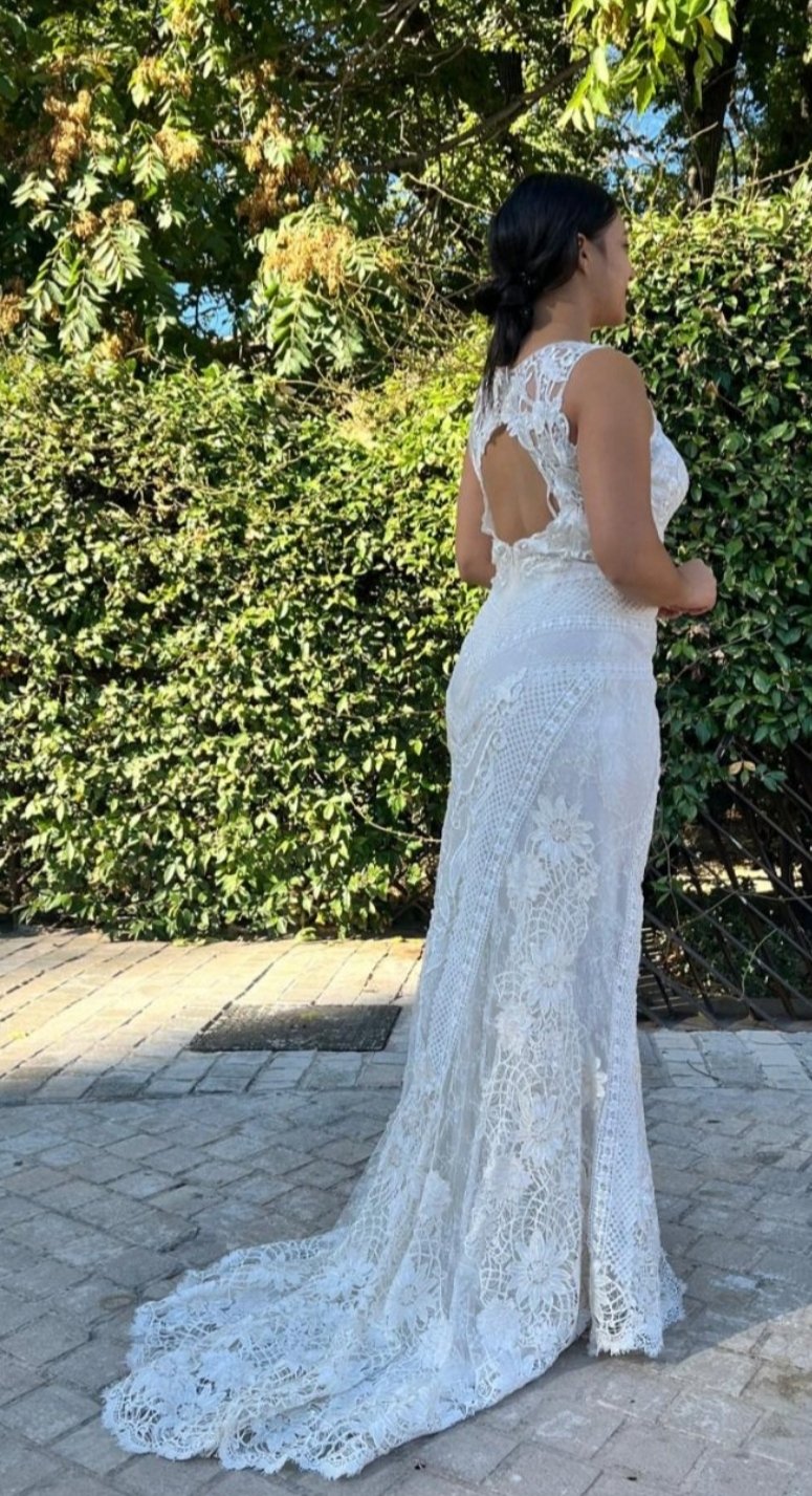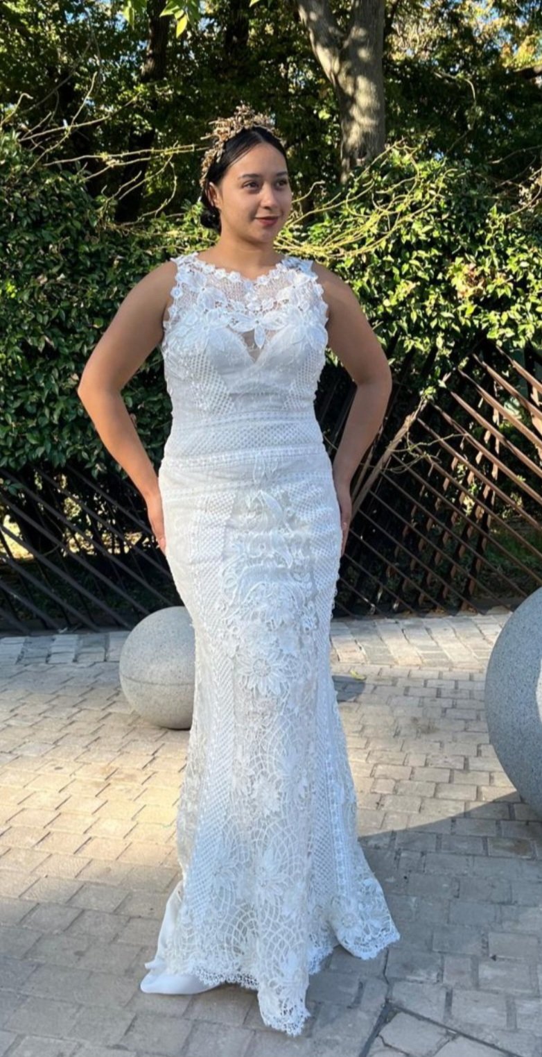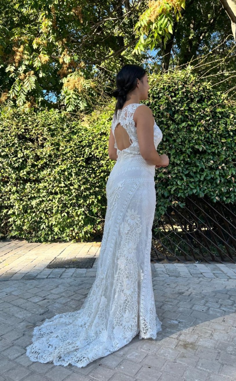 Este vestido de dos piezas es una auténtica obra de arte nupcial, donde el protagonismo absoluto lo toma un encaje inglés exquisito, delicado y lleno de detalles que hablan de tradición, romanticismo y elegancia atemporal. Cada motivo floral parece tejido con intención, aportando textura, profundidad y una belleza serena que envuelve toda la silueta.