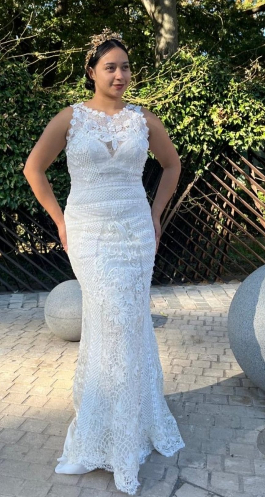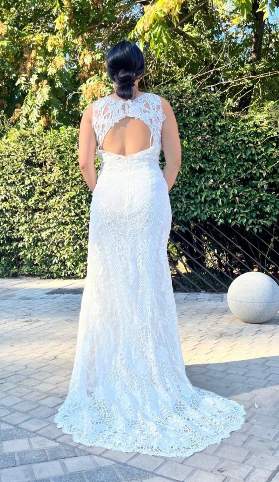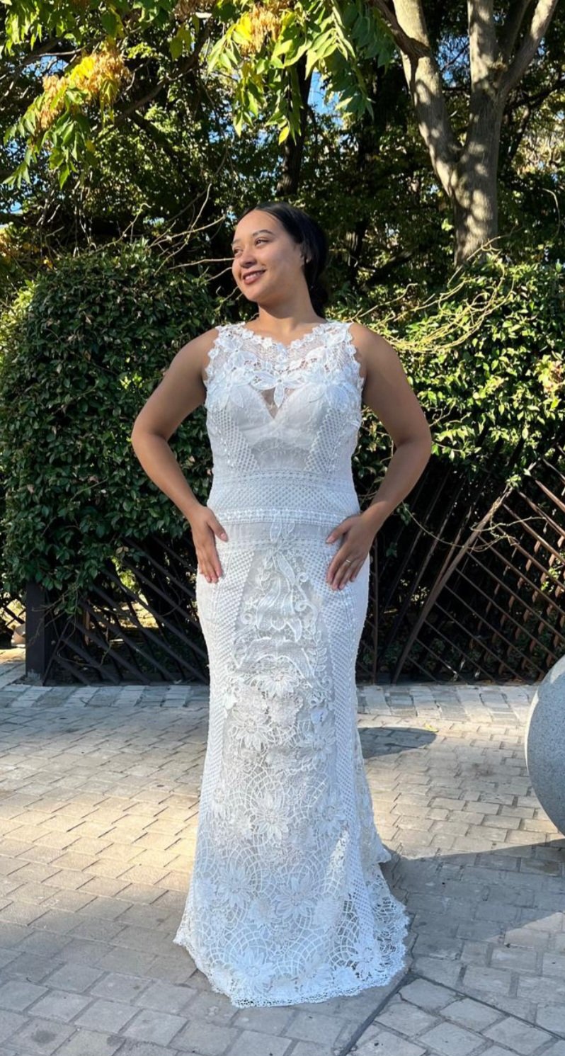 Este vestido de dos piezas es una auténtica obra de arte nupcial, donde el protagonismo absoluto lo toma un encaje inglés exquisito, delicado y lleno de detalles que hablan de tradición, romanticismo y elegancia atemporal. Cada motivo floral parece tejido con intención, aportando textura, profundidad y una belleza serena que envuelve toda la silueta.