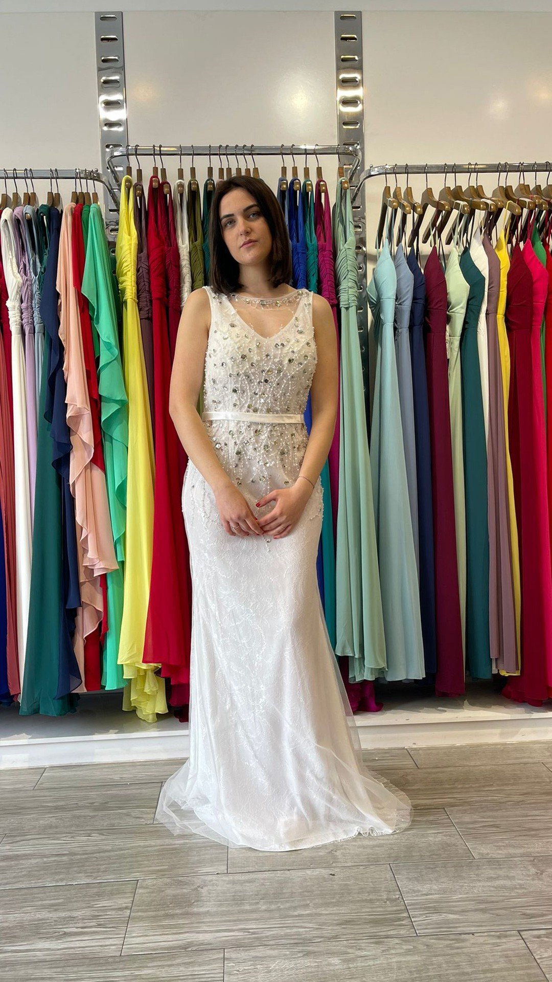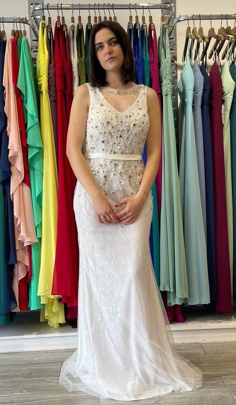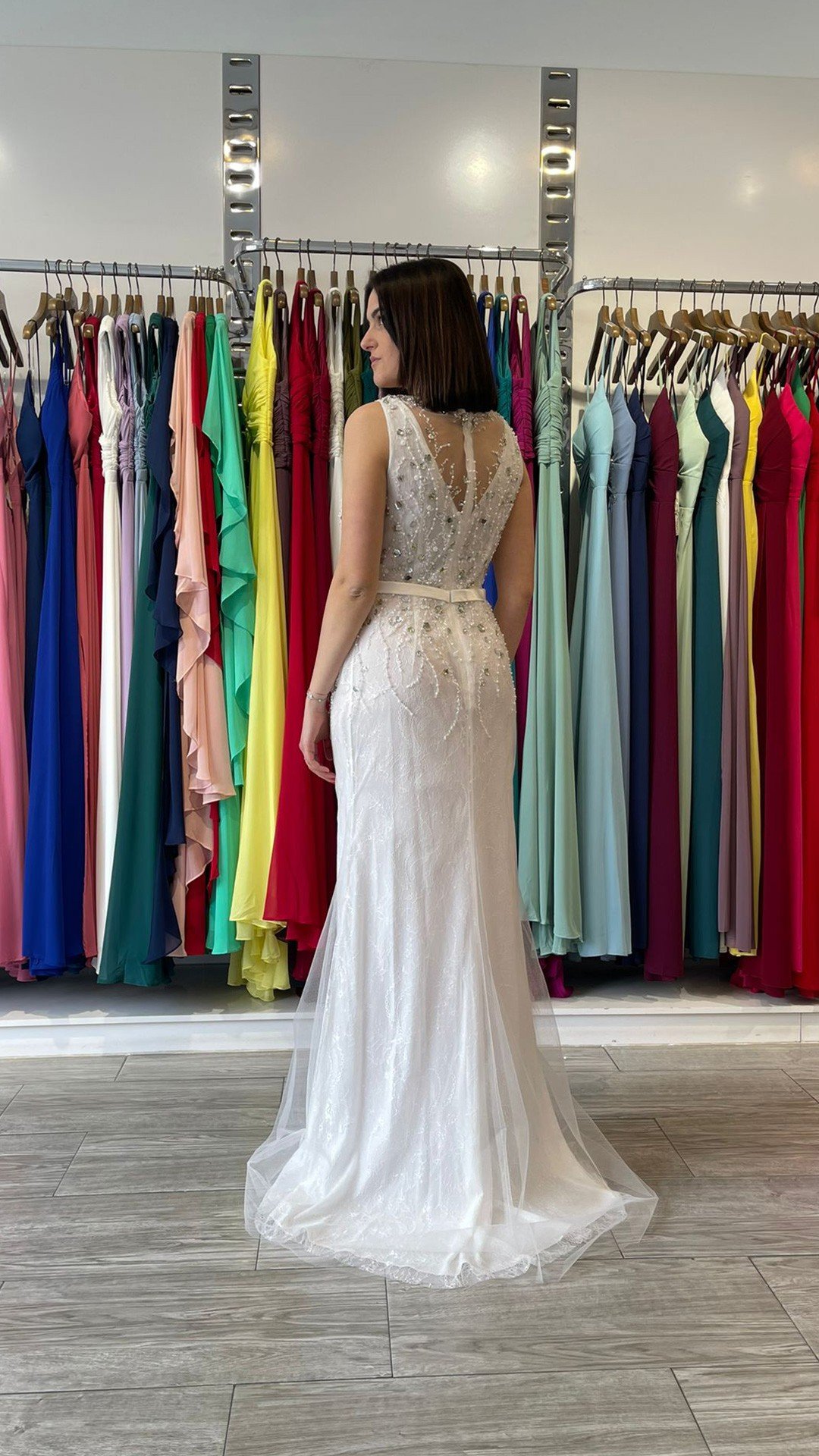 Vestido largo blanco de estilo elegante, con silueta recta y caída fluida. Presenta un corpiño bordado con pedrería y transparencias sutiles, escote redondeado y cinturilla fina que marca la cintura. Ideal para novia o evento formal.