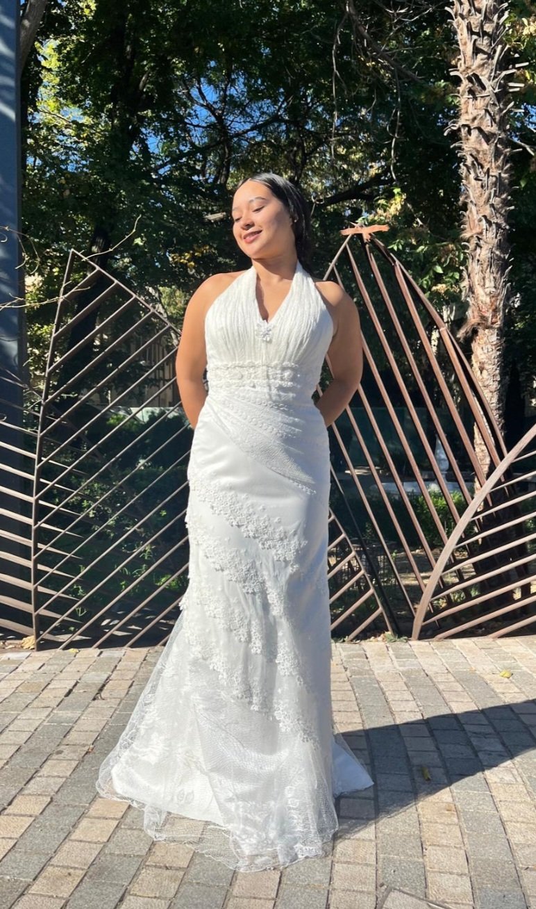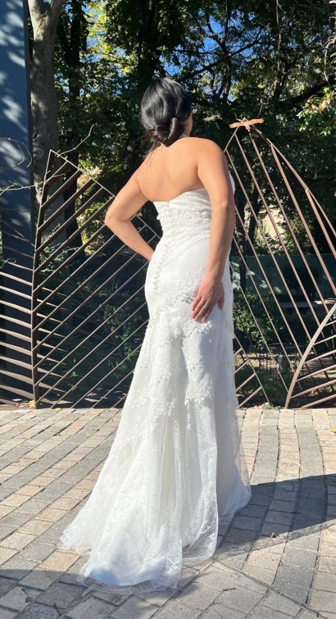 La falda de corte sirena cae con una caída impecable, ajustándose suavemente hasta abrirse en la parte inferior con un movimiento delicado y envolvente, aportando ese toque majestuoso tan característico de los vestidos que dejan huella. En la espalda, el escote trasero añade un punto de sensualidad sutil y elegante, convirtiéndose en un detalle inesperado y cautivador.