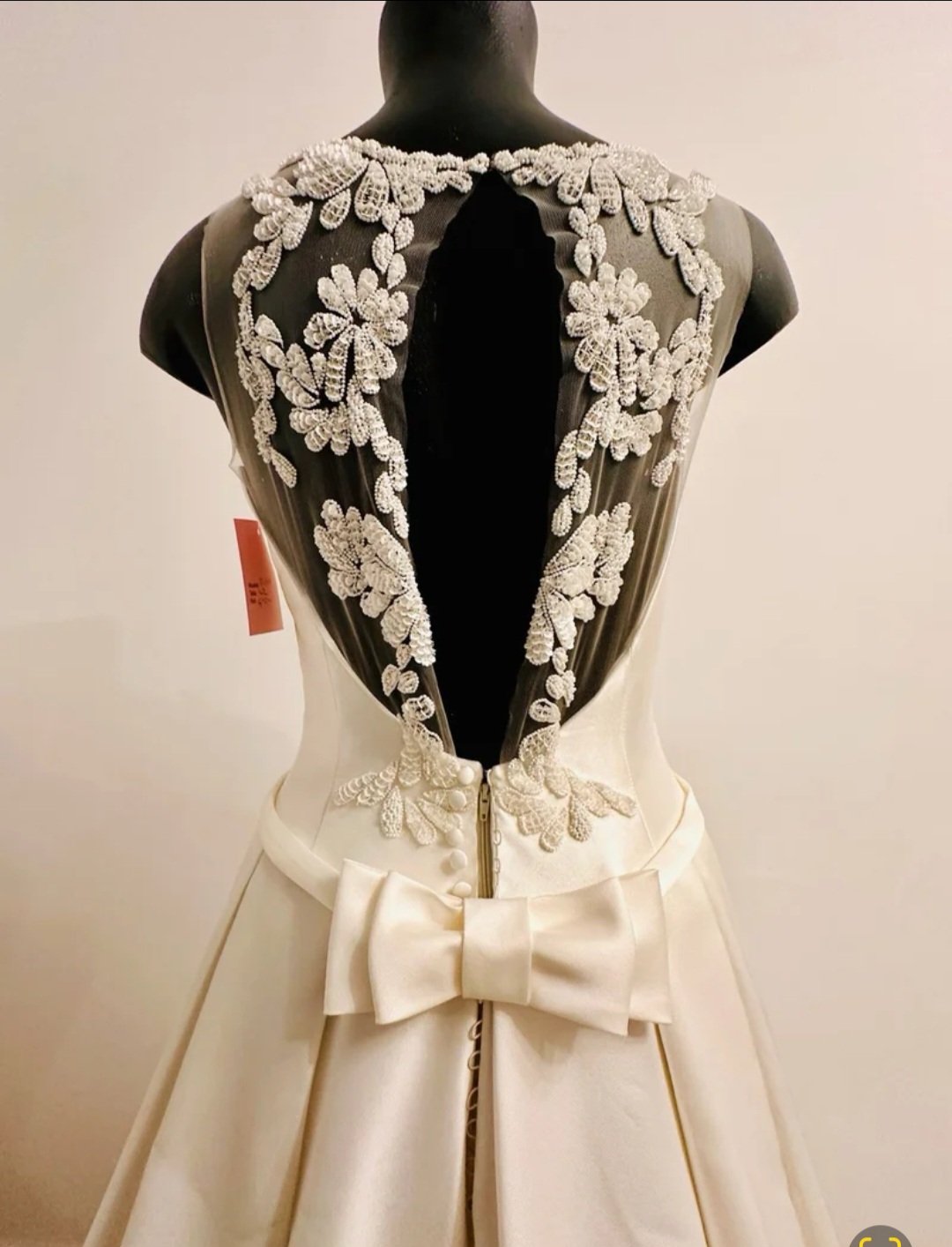 La parte superior destaca por su refinado trabajo de transparencias cuidadosamente integradas, que envuelven el cuerpo con sutileza y feminidad. El escote y la espalda están delicadamente adornados con pedrería y bordados joya, creando un juego de luz elegante y sofisticado que realza la figura sin excesos. El escote de espalda, profundo y armonioso, se convierte en uno de los grandes protagonistas del diseño, aportando sensualidad y exclusividad con un acabado impecable.