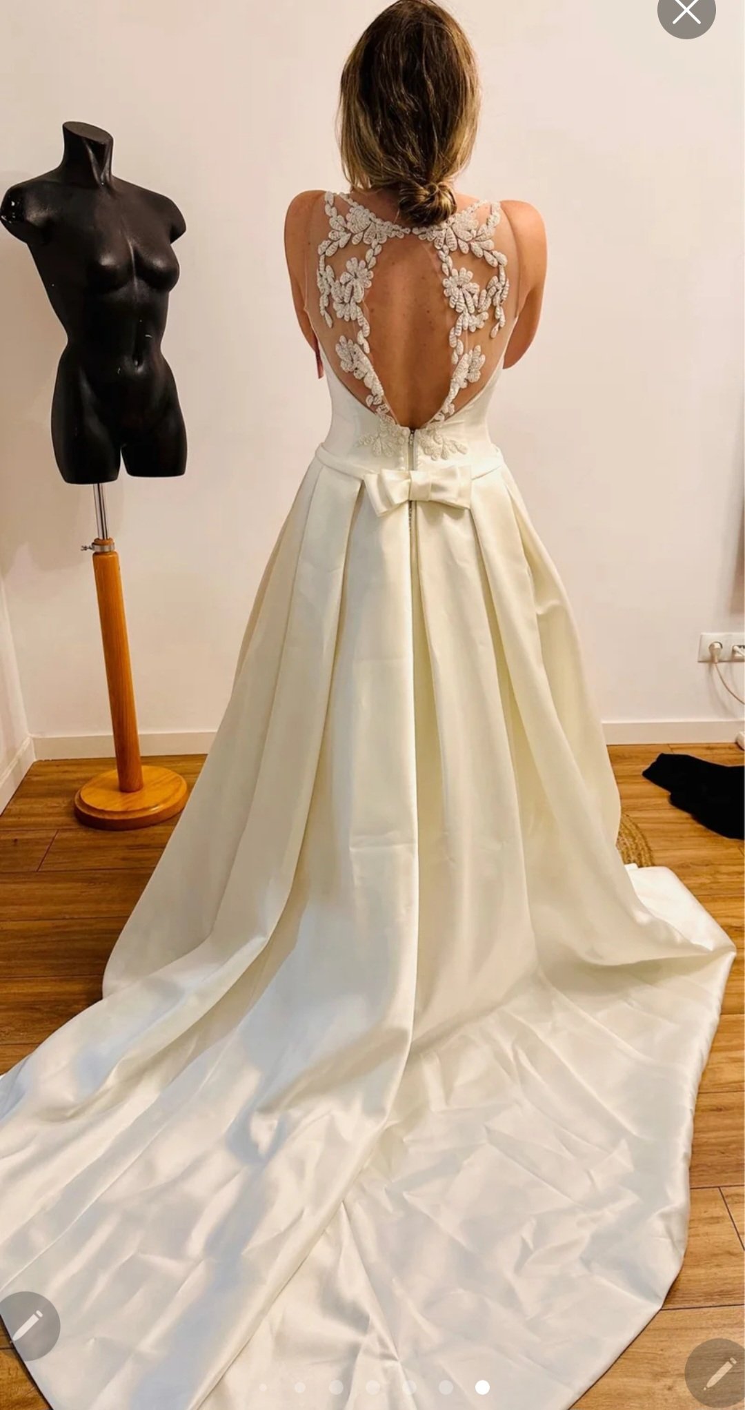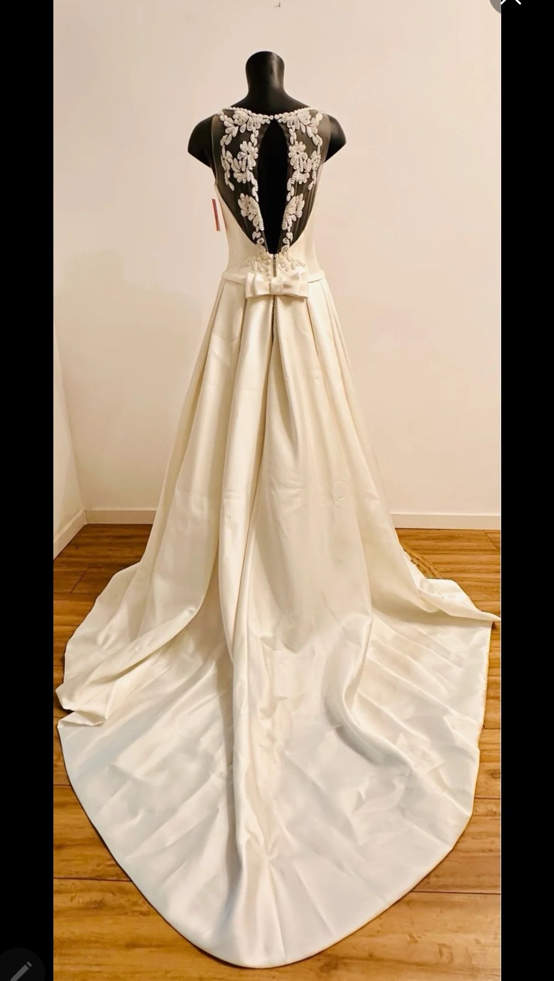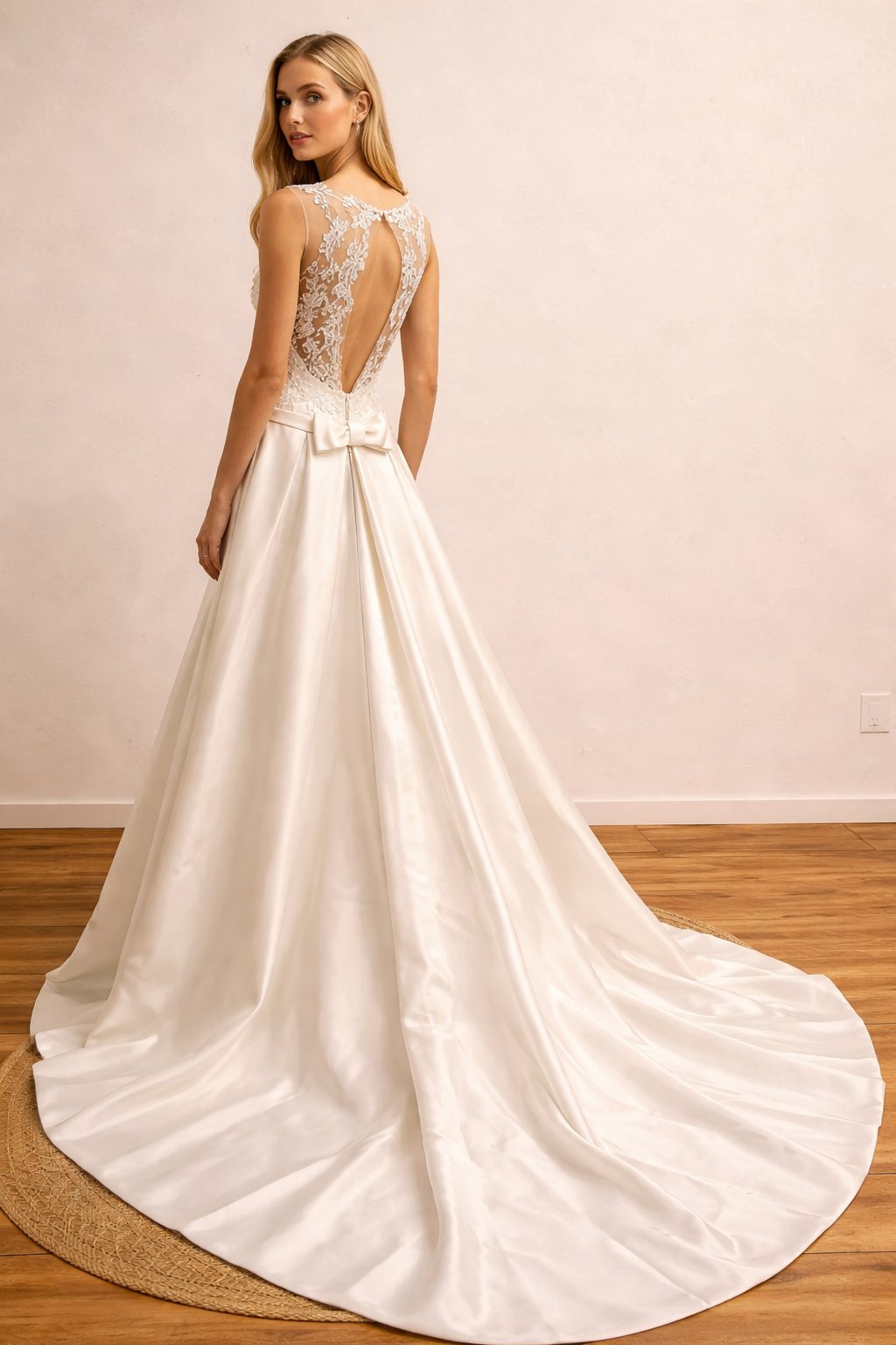 Confeccionado en exquisito raso de alta calidad, su falda fluye con una caída impecable que aporta movimiento, luminosidad y una silueta majestuosa. La gran cola realza el conjunto, aportando un aire ceremonial y romántico que convierte cada paso en un momento inolvidable.