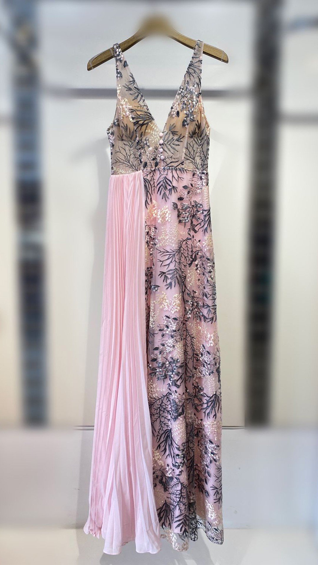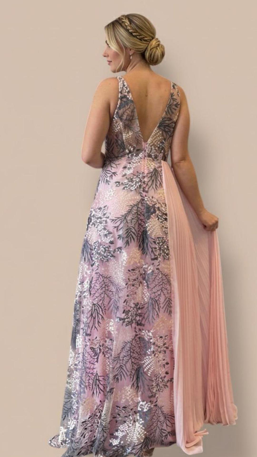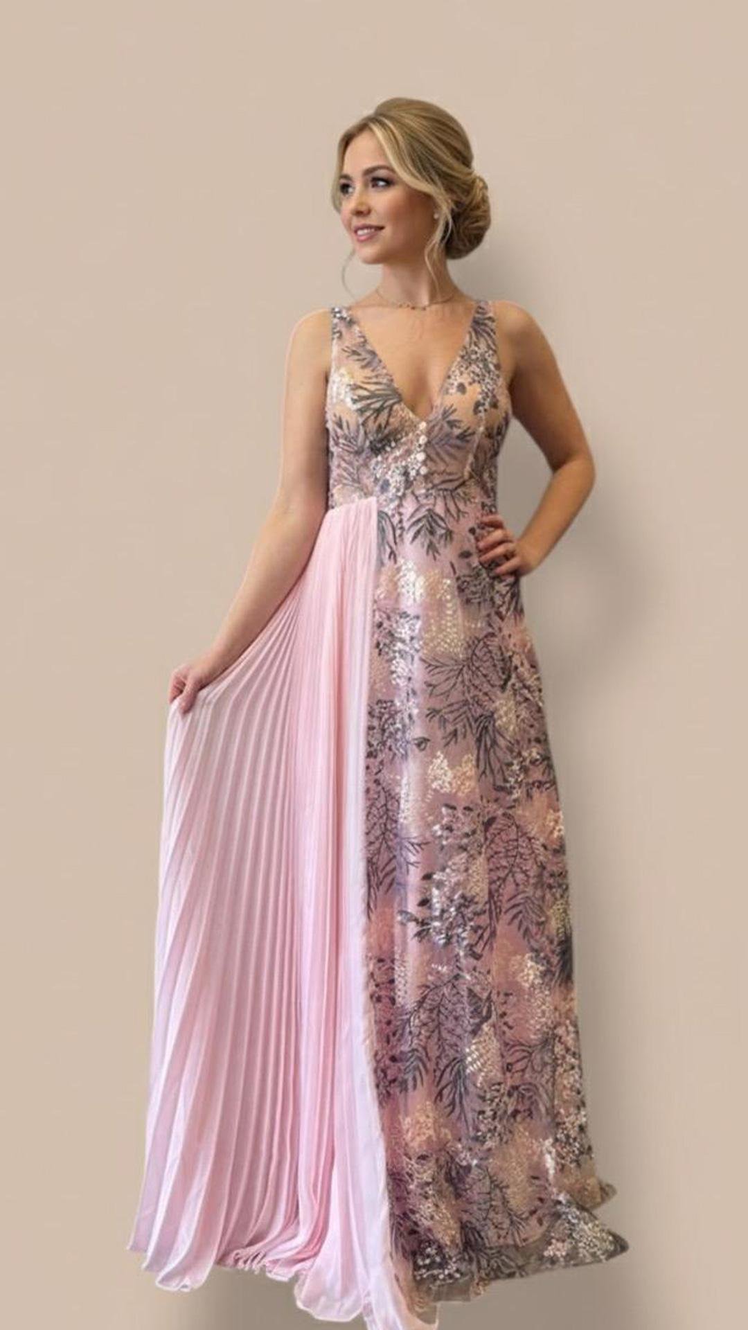 Vestido largo y sofisticado de estilo romántico, con escote en V y delicados bordados florales metalizados que aportan brillo y elegancia. Destaca su falda combinada, con una parte plisada en tono rosa suave que añade movimiento y ligereza. Ideal para eventos especiales, combina feminidad, modernidad y un aire etéreo muy refinado.